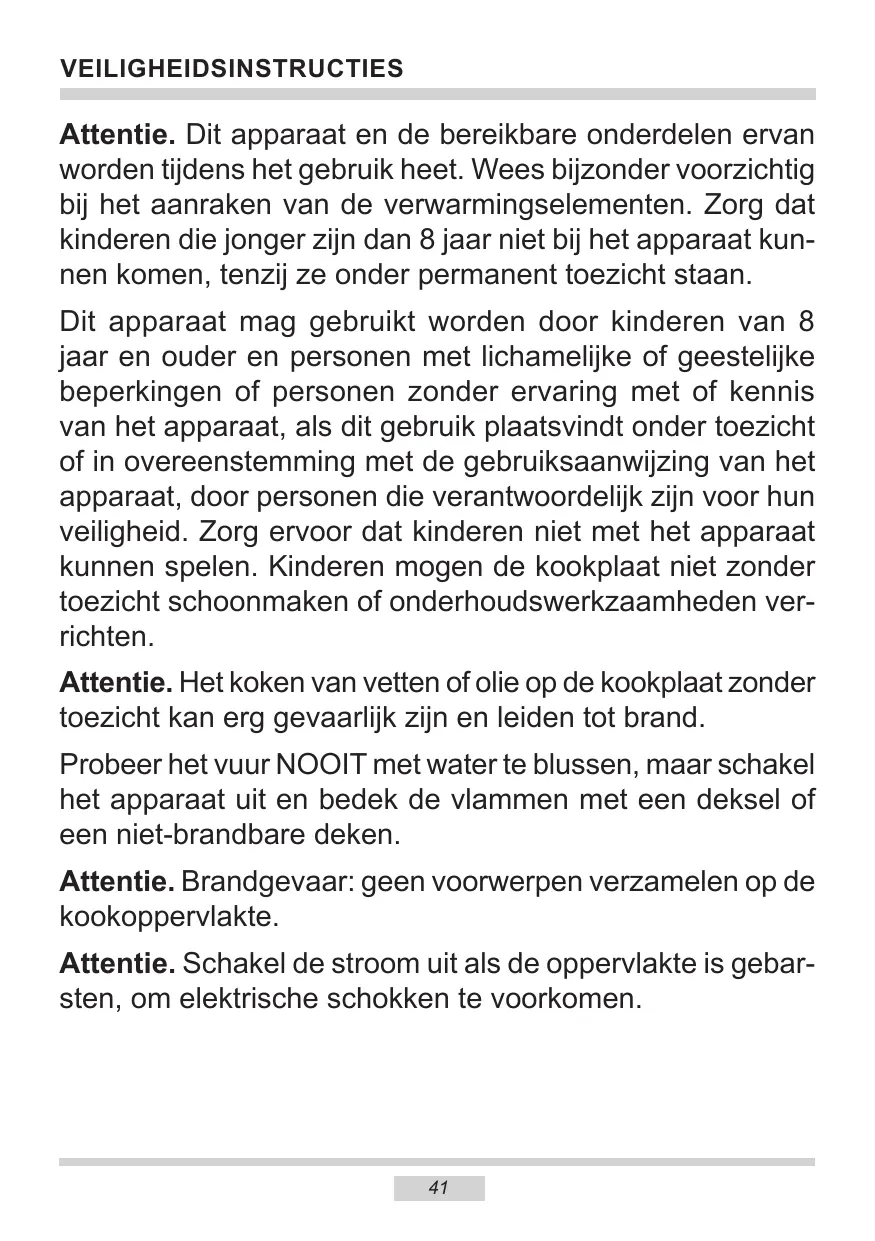 VEILIGHEIDSINSTRUCTIES Attentie. Dit apparaat en de bereikbare onderdelen ervan worden tijdens het gebruik heet. Wees bijzonder voorzichtig bij het aanraken van de verwarmingselementen. Zorg dat kinderen die jonger zijn dan 8 jaar niet bij het apparaat kun- nen komen, tenzij ze onder permanent toezicht staan. Dit apparaat mag gebruikt worden door kinderen van 8 jaar en ouder en personen met lichamelijke of geestelijke beperkingen of personen zonder ervaring met of kennis van het apparaat, als dit gebruik plaatsvindt onder toezicht of in overeenstemming met de gebruiksaanwijzing van het apparaat, door personen die verantwoordelijk zijn voor hun veiligheid. Zorg ervoor dat kinderen niet met het apparaat kunnen spelen. Kinderen mogen de kookplaat niet zonder toezicht schoonmaken of onderhoudswerkzaamheden ver- richten. Attentie. Het koken van vetten of olie op de kookplaat zonder toezicht kan erg gevaarlijk zijn en leiden tot brand. Probeer het vuur NOOIT met water te blussen, maar schakel het apparaat uit en bedek de vlammen met een deksel of een niet-brandbare deken. Attentie. Brandgevaar: geen voorwerpen verzamelen op de kookoppervlakte. Attentie. Schakel de stroom uit als de oppervlakte is gebar- sten, om elektrische schokken te voorkomen.