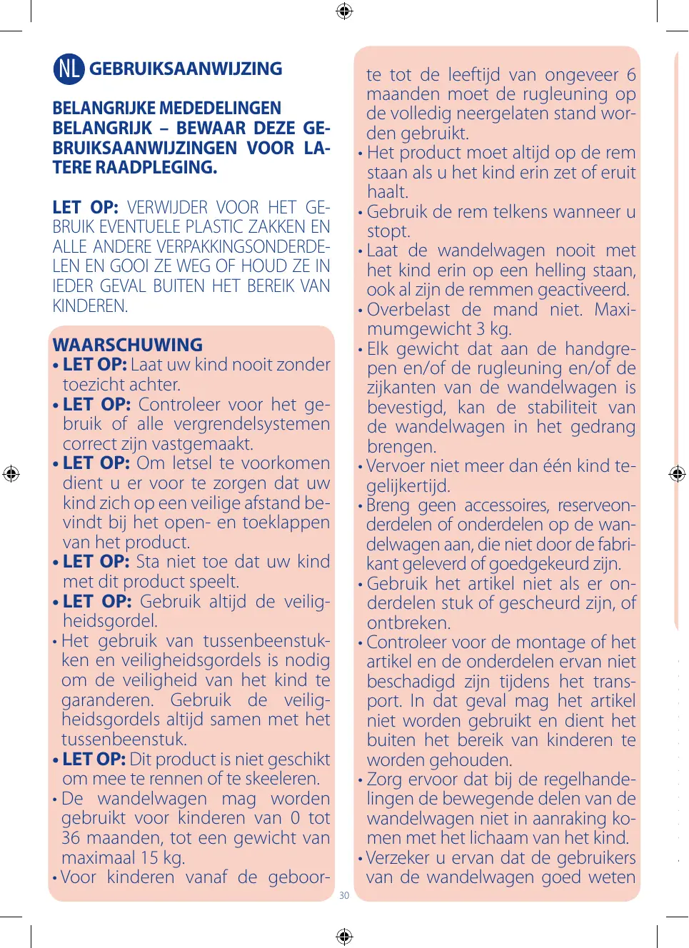 •AVERTISSEMENT : Pour éviter toute blessure, maintenir votre enfant à l’écart lors du dépliage et du pliage du produit. •AVERTISSEMENT : Ne pas laisser votre enfant jouer avec ce produit. • AVERTISSEMENT : Toujours utiliser le système de retenue. • L’utilisation de l’entrejambe et du harnais de sécurité est indispensable pour garantir la sécurité de l’enfant. Ne jamais utiliser l’entrejambe sans le harnais de sécurité. •A VERTISSEMENT : Ce produit ne convient pas pour faire du jogging ou des promenades en rollers. • L’utilisation de la poussette est autorisée pour des enfants d’un âge compris entre 0 et 36 mois, jusqu’à un poids maximum de 15 kg. • De la naissance de l’enfant à ses 6 mois environ, le dossier doit être 14