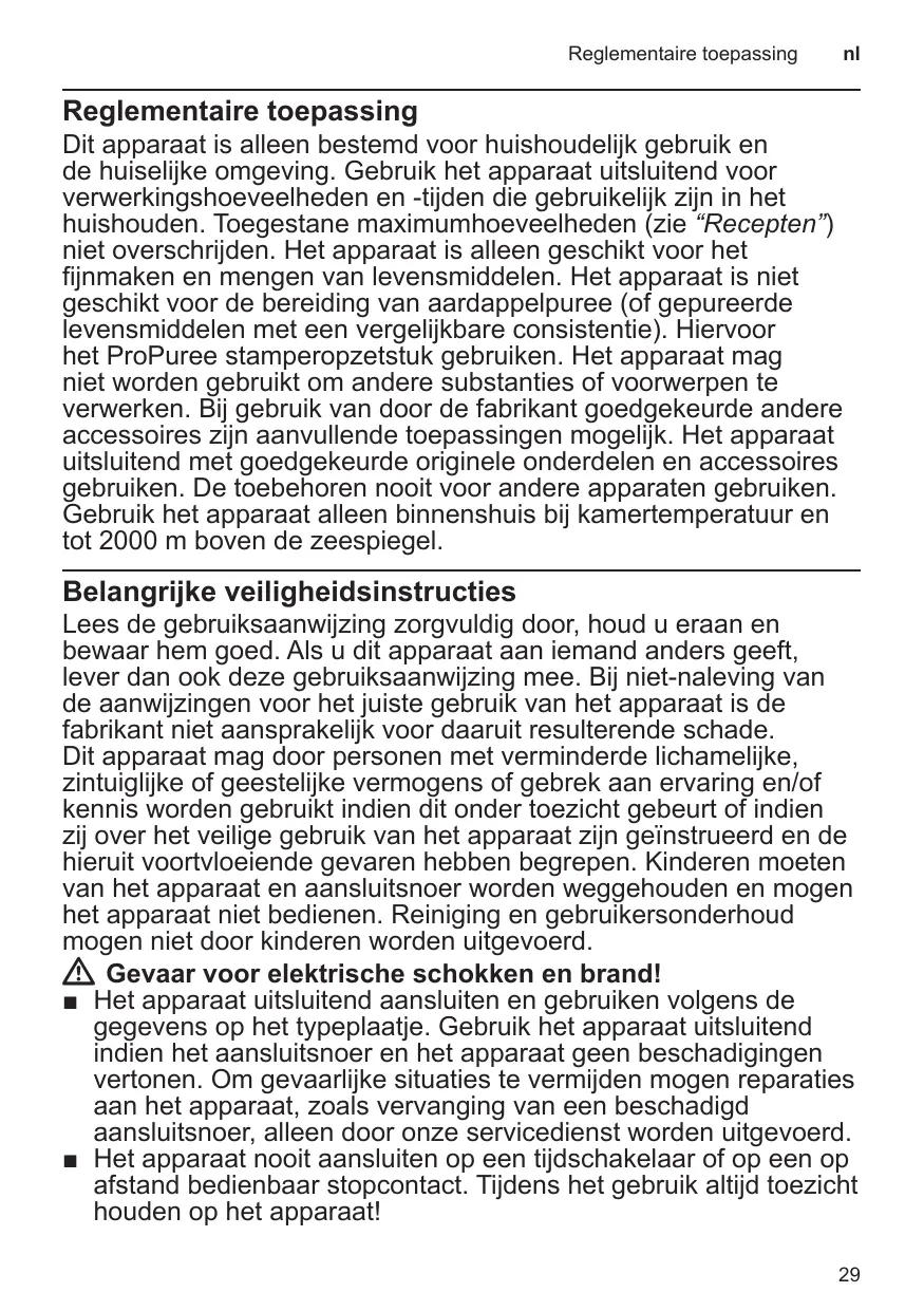 Dit apparaat is alleen bestemd voor huishoudelijk gebruik en de huiselijke omgeving. Gebruik het apparaat uitsluitend voor verwerkingshoeveelheden en -tijden die gebruikelijk zijn in het huishouden. Toegestane maximumhoeveelheden (zie “Recepten”) niet overschrijden. Het apparaat is alleen geschikt voor het fijnmaken en mengen van levensmiddelen. Het apparaat is niet geschikt voor de bereiding van aardappelpuree (of gepureerde levensmiddelen met een vergelijkbare consistentie). Hiervoor het ProPuree stamperopzetstuk gebruiken. Het apparaat mag niet worden gebruikt om andere substanties of voorwerpen te verwerken. Bij gebruik van door de fabrikant goedgekeurde andere accessoires zijn aanvullende toepassingen mogelijk. Het apparaat uitsluitend met goedgekeurde originele onderdelen en accessoires gebruiken. De toebehoren nooit voor andere apparaten gebruiken. Gebruik het apparaat alleen binnenshuis bij kamertemperatuur en tot 2000 m boven de zeespiegel.