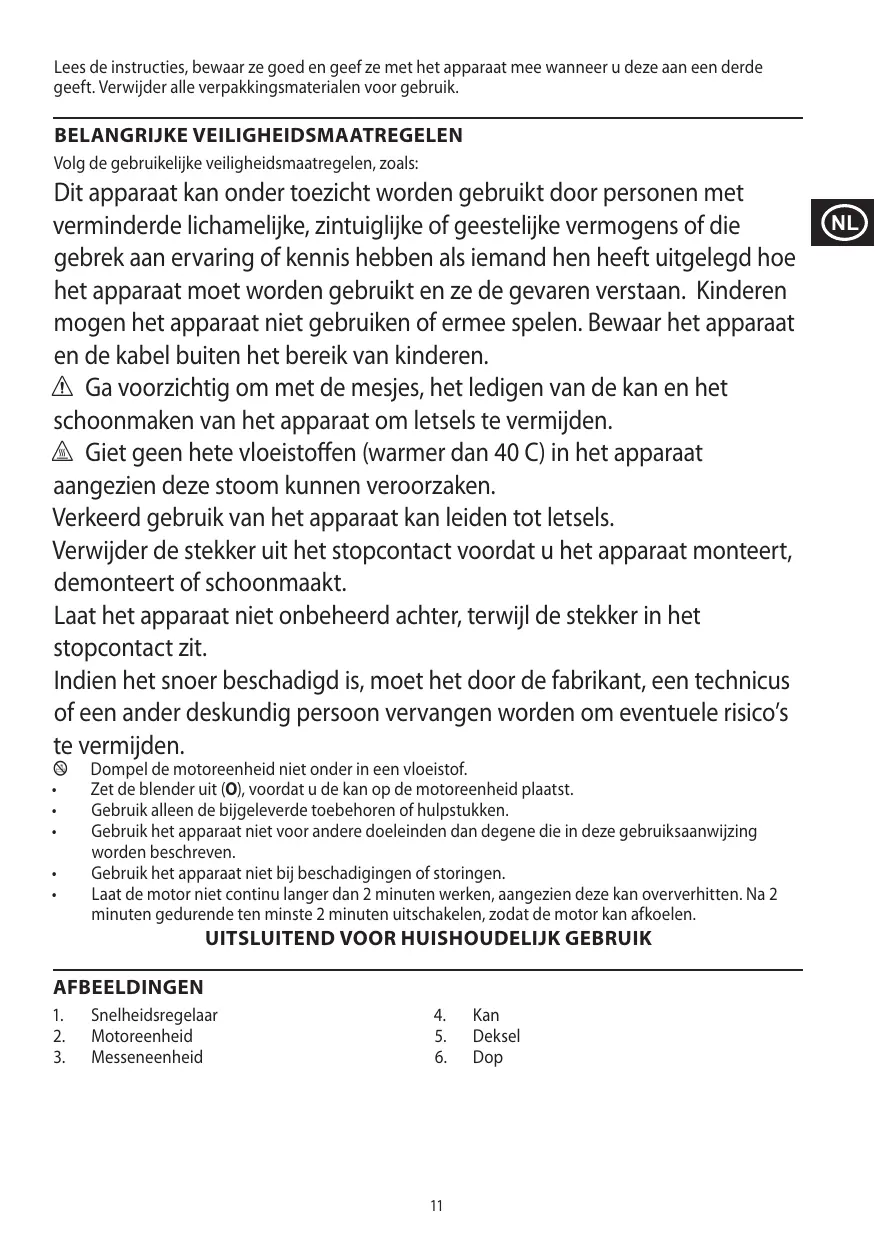 Dit apparaat kan onder toezicht worden gebruikt door personen met verminderde lichamelijke, zintuiglijke of geestelijke vermogens of die gebrek aan ervaring of kennis hebben als iemand hen heeft uitgelegd hoe het apparaat moet worden gebruikt en ze de gevaren verstaan. Kinderen mogen het apparaat niet gebruiken of ermee spelen. Bewaar het apparaat en de kabel buiten het bereik van kinderen. c Ga voorzichtig om met de mesjes, het ledigen van de kan en het schoonmaken van het apparaat om letsels te vermijden. h Giet geen hete vloeistoffen (warmer dan 40 C) in het apparaat aangezien deze stoom kunnen veroorzaken. Verkeerd gebruik van het apparaat kan leiden tot letsels. Verwijder de stekker uit het stopcontact voordat u het apparaat monteert, demonteert of schoonmaakt. Laat het apparaat niet onbeheerd achter, terwijl de stekker in het stopcontact zit. Indien het snoer beschadigd is, moet het door de fabrikant, een technicus of een ander deskundig persoon vervangen worden om eventuele risico’s te vermijden.