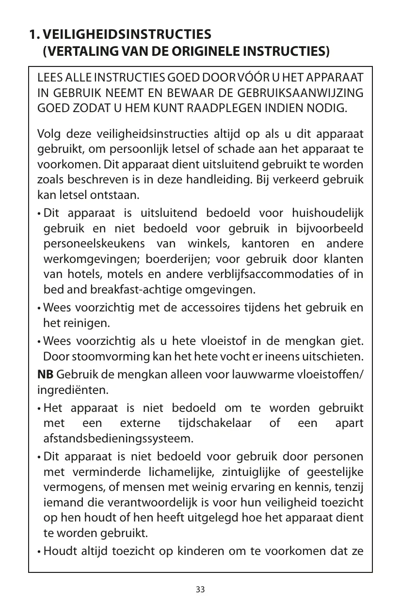 - Wanneer u vloeistoffen (vooral hete vloeistoffen) wil mixen, gebruik dan een hoge, hittebestendige kom of bereid kleine hoeveelheden tegelijk om morsen, spatten en de kans op letsel door verbranding te verkleinen. NB. De meegeleverde mengkan is niet geschikt voor hete vloeistoffen.