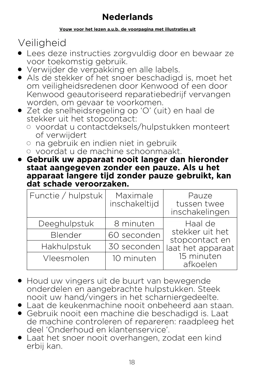étiquettes. O Si le cordon ou la prise sont endommagés, il faut les faire remplacer, pour des raisons de sécurité, par Kenwood ou un réparateur agréé par Kenwood pour éviter tout accident. O Mettez le sélecteur de vitesse sur la position « O » (Arrêt) et débranchez l’appareil : O avant d’installer ou de retirer le cache-sortie/ l’ustensile/l’accessoire ; O après utilisation ou lorsqu’il n’est pas utilisé ; O avant toute opération de nettoyage. O N’utilisez pas votre appareil pendant plus de temps que celui spécifié ci-dessous sans période d’arrêt. Si vous l’utilisez pendant de plus longues périodes, vous risquez d’endommager l’appareil. Fonction/ Temps Temps d’arrêt entre accessoire d’utilisation les utilisations maximal N’utilisez jamais un accessoire non autorisé ou plusieurs accessoires en même temps. Ne dépassez jamais les quantités définies dans le tableau des conseils d’utilisation. Faites attention lorsque vous soulevez l’appareil. Vérifiez que la tête est bien enclenchée en position basse et que le bol, les accessoires, les cache-sorties et le cordon d’alimentation soient bien fixés avant de soulever l’appareil. Les enfants doivent être sous surveillance pour veiller à ce qu’ils ne jouent pas avec l’appareil. Ne déplacez pas et ne soulevez pas la tête du batteur lorsqu’un accessoire y est fixé, ou le robot pâtissier multifonction pourrait perdre en stabilité. Veillez à ce que l’appareil en fonctionnement ne se trouve pas trop près du bord du plan de travail. Les appareils peuvent être utilisés par des personnes dont les capacités physiques, sensorielles ou mentales sont diminuées, ou qui ne disposent pas des connaissances ou de l’expérience nécessaires, si elles ont été formées et encadrées pour l’utilisation des appareils, et si elles ont conscience des risques encourus. Toute mauvaise utilisation de votre appareil peut être source de blessures. Cet appareil ne doit pas être utilisé par des enfants. Veuillez garder l’appareil et le cordon hors de portée des enfants. N’employez l’appareil qu’à des fins domestiques. Kenwood décline toute responsabilité dans les cas où l’appareil est utilisé incorrectement ou que les présentes instructions ne sont pas respectées.