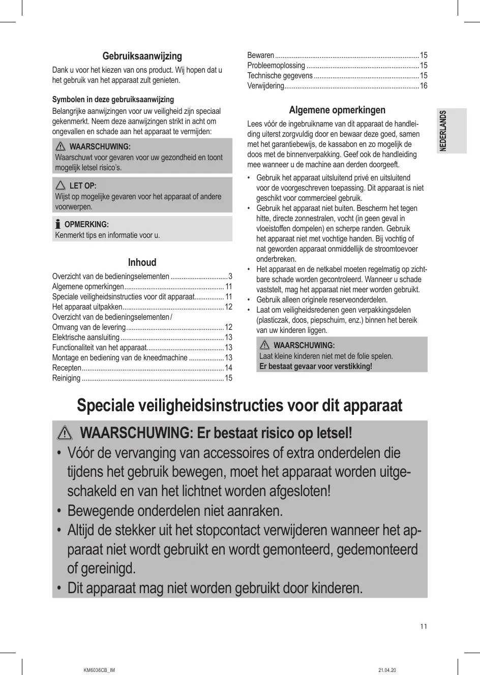 OPMERKING: Kort gebruik: Gebruik het apparaat niet langer dan 5 minuten voor zwaar deeg, en laat het daarna 10 minuten afkoelen.
