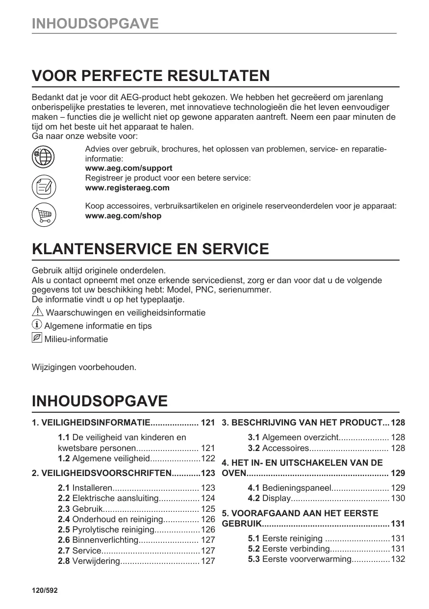 Bedankt dat je voor dit AEG-product hebt gekozen. We hebben het gecreëerd om jarenlang onberispelijke prestaties te leveren, met innovatieve technologieën die het leven eenvoudiger maken – functies die je wellicht niet op gewone apparaten aantreft. Neem een paar minuten de tijd om het beste uit het apparaat te halen. Ga naar onze website voor: Advies over gebruik, brochures, het oplossen van problemen, service- en reparatieinformatie: www.aeg.com/support Registreer je product voor een betere service: www.registeraeg.com Koop accessoires, verbruiksartikelen en originele reserveonderdelen voor je apparaat: www.aeg.com/shop