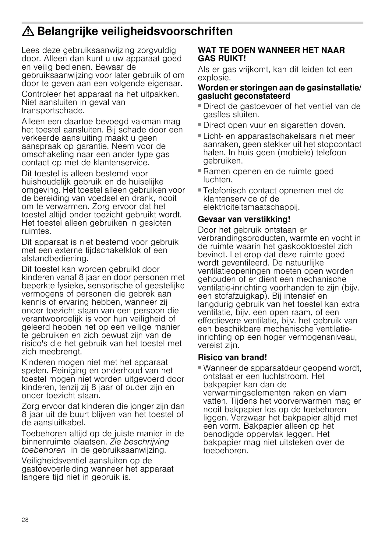 GAS RUIKT! Als er gas vrijkomt, kan dit leiden tot een explosie. Worden er storingen aan de gasinstallatie/ gaslucht geconstateerd ■ Direct de gastoevoer of het ventiel van de gasfles sluiten. ■ Direct open vuur en sigaretten doven. ■ Licht- en apparaatschakelaars niet meer aanraken, geen stekker uit het stopcontact halen. In huis geen (mobiele) telefoon gebruiken. ■ Ramen openen en de ruimte goed luchten. ■ Telefonisch contact opnemen met de klantenservice of de elektriciteitsmaatschappij. Gevaar van verstikking! Door het gebruik ontstaan er verbrandingsproducten, warmte en vocht in de ruimte waarin het gaskooktoestel zich bevindt. Let erop dat deze ruimte goed wordt geventileerd. De natuurlijke ventilatieopeningen moeten open worden gehouden of er dient een mechanische ventilatie-inrichting voorhanden te zijn (bijv. een stofafzuigkap). Bij intensief en langdurig gebruik van het toestel kan extra ventilatie, bijv. een open raam, of een effectievere ventilatie, bijv. het gebruik van een beschikbare mechanische ventilatieinrichting op een hoger vermogensniveau, vereist zijn. Risico van brand! ■ Wanneer de apparaatdeur geopend wordt, ontstaat er een luchtstroom. Het bakpapier kan dan de verwarmingselementen raken en vlam vatten. Tijdens het voorverwarmen mag er nooit bakpapier los op de toebehoren liggen. Verzwaar het bakpapier altijd met een vorm. Bakpapier alleen op het benodigde oppervlak leggen. Het bakpapier mag niet uitsteken over de toebehoren. Risico van brand! Brandbare voorwerpen die in de binnenruimte worden bewaard kunnen vlam vatten. Geen brandbare voorwerpen in de binnenruimte bewaren. Nooit de deur openen wanneer er sprake is van rookontwikkeling in het toestel. Schakel het toestel uit en haal de stekker uit het stopcontact of schakel de zekering in de meterkast uit. Gastoevoer afsluiten. ■ Hete olie en heet vet vatten snel vlam. Hete olie en heet vet nooit gebruiken zonder toezicht. Vuur nooit blussen met water. Schakel de kookzone uit. Vlammen voorzichtig met een deksel, smoordeksel of iets dergelijks verstikken. ■ De kookzones worden erg heet. Nooit brandbare voorwerpen op de kookplaat leggen. Geen voorwerpen op de kookplaat leggen. ■ Het apparaat wordt zeer heet, brandbaar materiaal kan vlam vatten. Nooit brandbaar materiaal (bijv. sprayflacons, reinigingsmiddelen) onder het apparaat of in de onmiddellijke nabijheid ervan opslaan of gebruiken. Nooit brandbare voorwerpen op of in het apparaat leggen. ■ Wanneer er gas-kookzones ingeschakeld zijn waar geen kookgerei op staat, wordt er tijdens het gebruik zeer veel warmte ontwikkeld. Het toestel en een daarboven aangebrachte afzuigkap kunnen beschadigd raken of vlam vatten. Vetresten in de filter van de stofafzuigkap kunnen vlam vatten. Gebruik de gaskookzones alleen wanneer er kookgerei op staat. ■ De achterkant van het toestel wordt zeer heet. Dit kan leiden tot beschadiging van de aansluitleidingen. Elektriciteits- en gasleidingen mogen niet met de achterkant van het toestel in aanraking komen. Risico van verbranding! ■ Het toestel wordt zeer heet. Nooit de hete vlakken in de binnenruimte of verwarmingselementen aanraken. Het apparaat altijd laten afkoelen. Zorg ervoor dat er geen kinderen in de buurt zijn. ■ Toebehoren of vormen worden zeer heet. Neem hete toebehoren en vormen altijd met behulp van een pannenlap uit de binnenruimte.