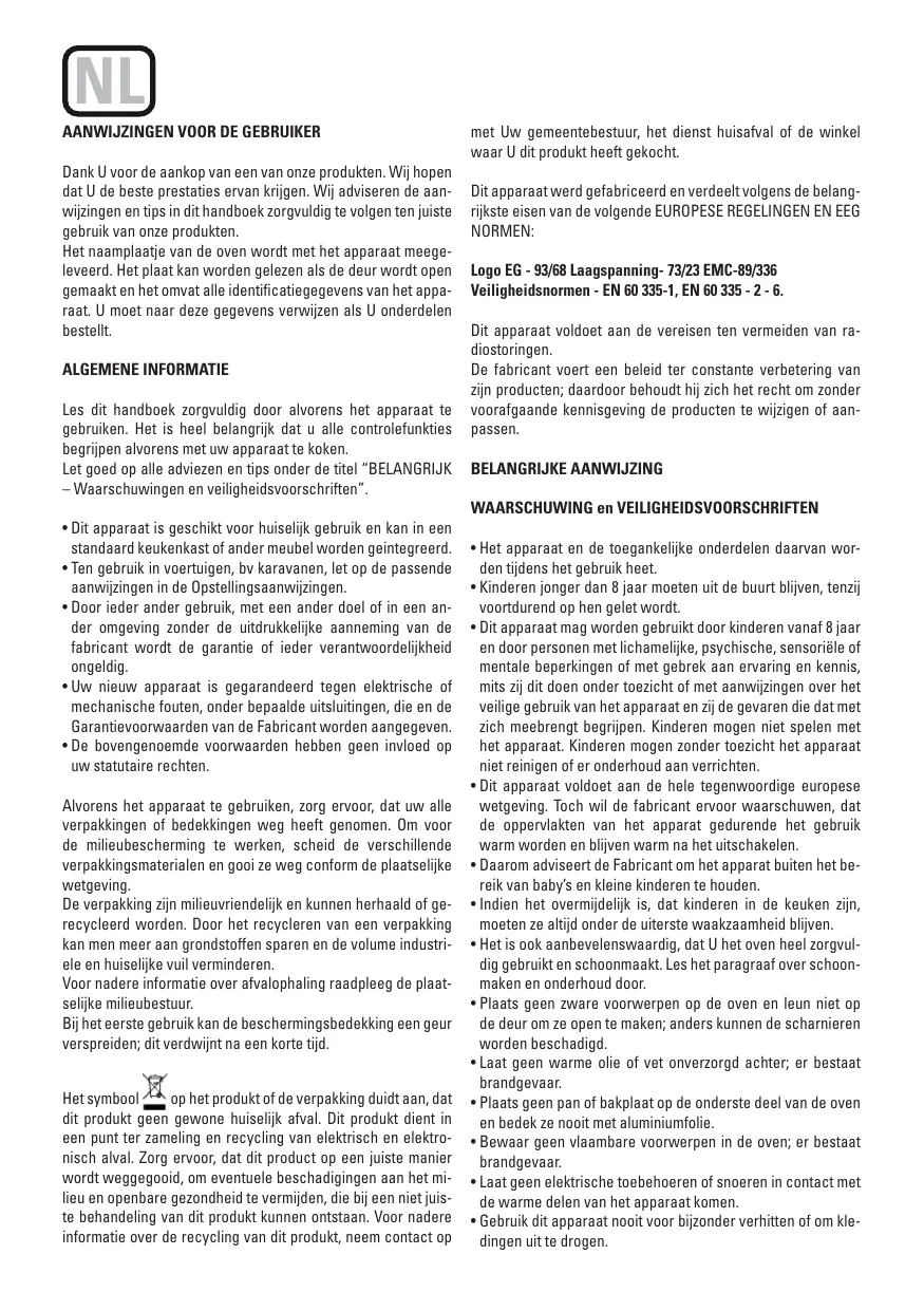 Il est important que vous compreniez bien toutes les fonctions de contrôle avant de commencer à cuisiner avec votre four. N’oubliez pas les conseils et les mises en garde indiqués sous le titre « IMPORTANT - Mises en garde et instructions de sécurité». • Cet appareil a été dessiné pour une utilisation privée dans les logements et peut être intégré dans une armoire de cuisine standard ou d’un autre type. • Pour son utilisation dans des véhicules du type caravanes, tenir compte de l’indication appropriée dans les Instructions d’Installation. • L’utilisation dans tout autre but ou dans tout autre milieu sans l’accord exprès du fabricant annulera toute déclaration de garantie ou de responsabilité. • Votre nouvel appareil est garanti contre tous défauts électriques ou mécaniques ; la garantie est soumise à des exclusions déterminées qui sont indiquées dans les Conditions de Garantie du Fabricant. • Ce qui précède n’affectera pas ses droits statutaires. Avant d’utiliser cet appareil, assurez-vous d’avoir retiré tout emballage de protection ou revêtement. Pour collaborer dans la protection de l’environnement, séparez les matériels d’emballage selon leurs différents types et éliminez-les conformément aux lois locales d’élimination de résidus. Les emballages sont conçus pour ne pas nuire l’environnement ; étant des produits écologiques, ils peuvent être récupérés ou recyclés. En recyclant l’emballage, vous contribuerez à une économie de matières premières et à une réduction du volume des détritus industriels et ménagers. Pour toute information supplémentaire sur l’élimination de résidus, veuillez vous adresser à votre agence environnementale locale. La première fois que vous utiliserez votre appareil, une odeur pourra se dégagée du revêtement protecteur ou de l’humidité ; cette odeur disparaîtra rapidement. Le symbole sur le produit ou sur son emballage indique que ce produit ne peut être traité comme les déchets ménagers normaux. Ce produit doit être remis au point de ramas-