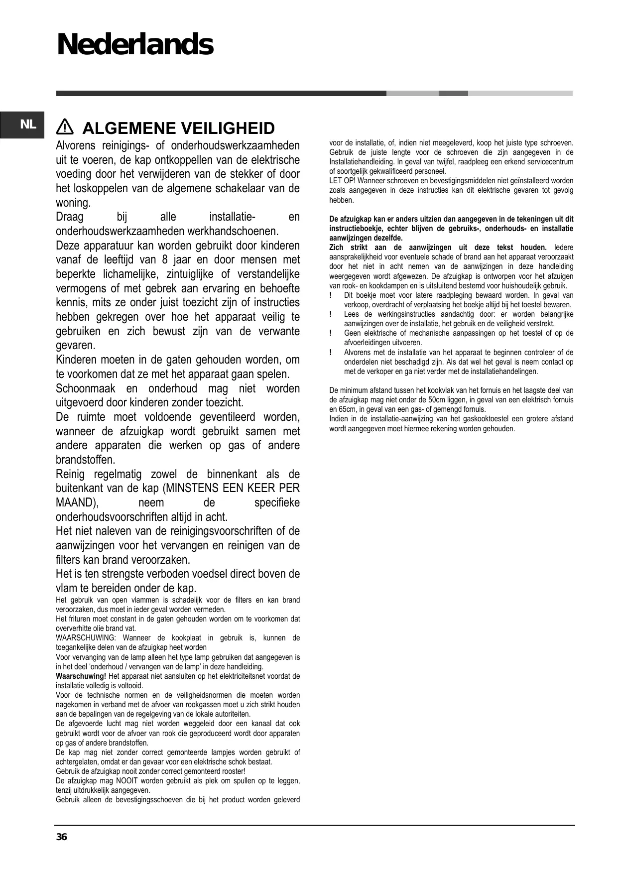 La pièce doit avoir une aération suffisante lorsque la hotte est utilisée conjointement avec d'autres appareils fonctionnant au gaz ou autres combustibles. La hotte doit être régulièrement nettoyée à la fois à l'intérieur et à l'extérieur (AU MOINS UNE FOIS PAR MOIS); cela devrait se faire en conformité avec les instructions d'entretien. Le non respect des instructions expressément fournies concernant le nettoyage de la hotte et des filtres peut provoquer des risques d'incendie. Ne pas flamber d’aliments sous la hotte.