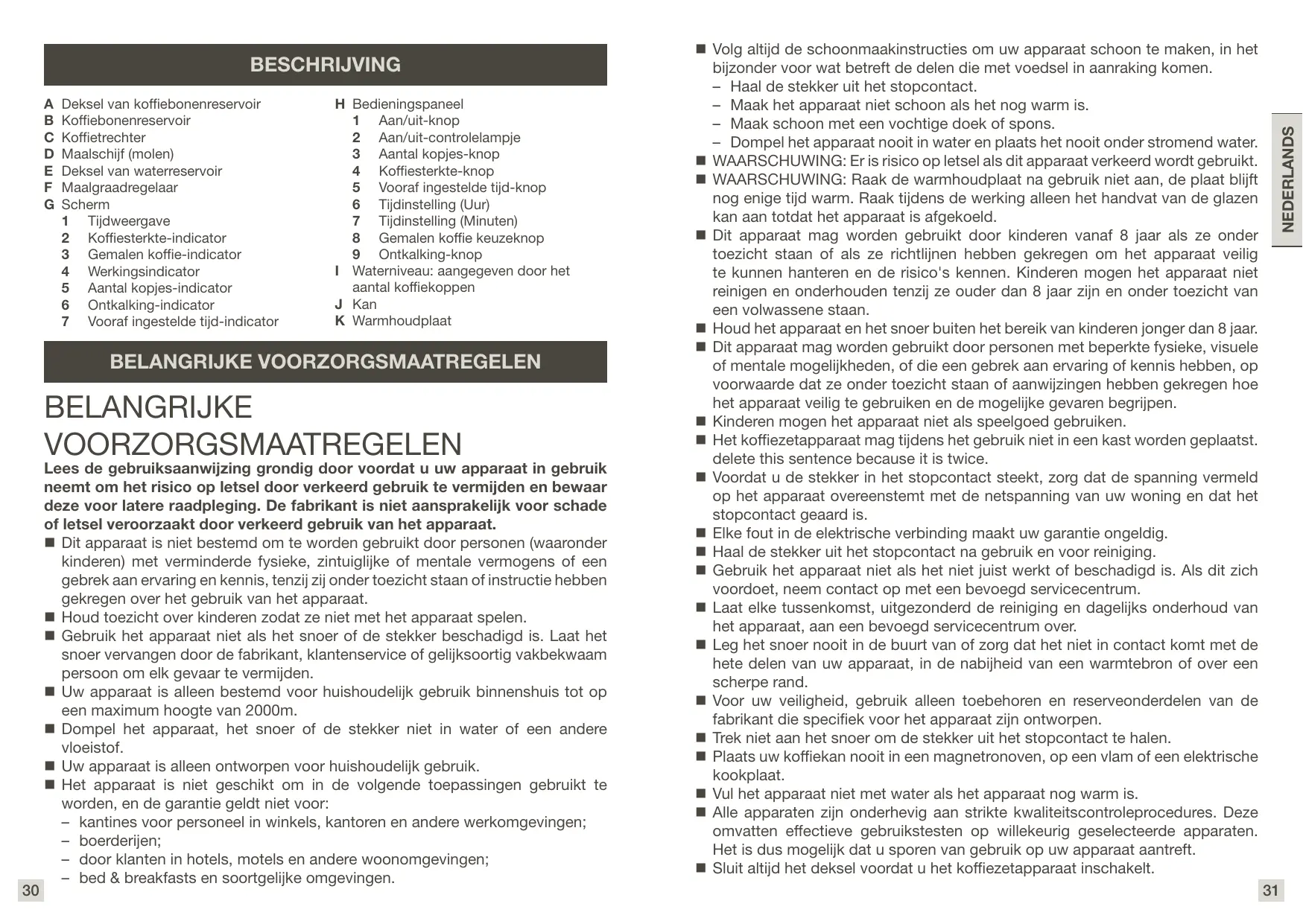 H Bedieningspaneel 1 Aan/uit-knop 2 Aan/uit-controlelampje 3 Aantal kopjes-knop 4 Koffiesterkte-knop 5 Vooraf ingestelde tijd-knop 6 Tijdinstelling (Uur) 7 Tijdinstelling (Minuten) 8 Gemalen koffie keuzeknop 9 Ontkalking-knop I Waterniveau: aangegeven door het aantal koffiekoppen J Kan K Warmhoudplaat