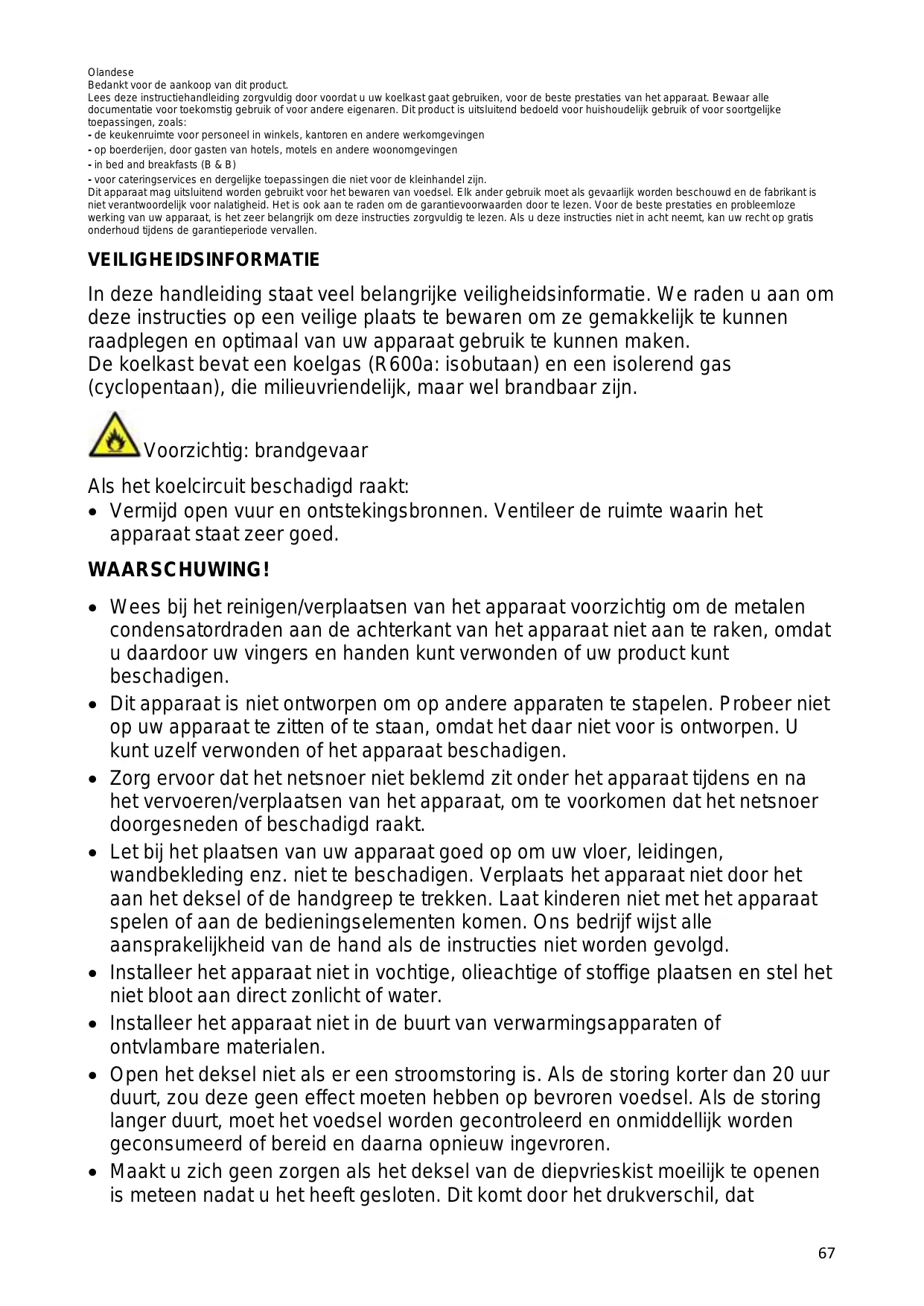 Olandese Bedankt voor de aankoop van dit product. Lees deze instructiehandleiding zorgvuldig door voordat u uw koelkast gaat gebruiken, voor de beste prestaties van het apparaat. Bewaar alle documentatie voor toekomstig gebruik of voor andere eigenaren. Dit product is uitsluitend bedoeld voor huishoudelijk gebruik of voor soortgelijke toepassingen, zoals: - de keukenruimte voor personeel in winkels, kantoren en andere werkomgevingen - op boerderijen, door gasten van hotels, motels en andere woonomgevingen - in bed and breakfasts (B & B) - voor cateringservices en dergelijke toepassingen die niet voor de kleinhandel zijn. Dit apparaat mag uitsluitend worden gebruikt voor het bewaren van voedsel. Elk ander gebruik moet als gevaarlijk worden beschouwd en de fabrikant is niet verantwoordelijk voor nalatigheid. Het is ook aan te raden om de garantievoorwaarden door te lezen. Voor de beste prestaties en probleemloze werking van uw apparaat, is het zeer belangrijk om deze instructies zorgvuldig te lezen. Als u deze instructies niet in acht neemt, kan uw recht op gratis onderhoud tijdens de garantieperiode vervallen. VEILIGHEIDSINFORMATIE In deze handleiding staat veel belangrijke veiligheidsinformatie. We raden u aan om deze instructies op een veilige plaats te bewaren om ze gemakkelijk te kunnen raadplegen en optimaal van uw apparaat gebruik te kunnen maken. De koelkast bevat een koelgas (R600a: isobutaan) en een isolerend gas (cyclopentaan), die milieuvriendelijk, maar wel brandbaar zijn. Voorzichtig: brandgevaar Als het koelcircuit beschadigd raakt: