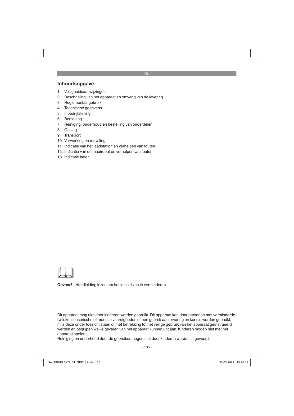 • Gebruik voor de reiniging van de laadcontacten aan de maairobot (1) en het laadstation (19) reinigingsmiddel voor metaal of zeer fijn schuurpapier. Maak deze schoon om een efficiënt laadproces te garanderen. 7.2 Onderhoud Versleten of beschadigde klingen (10) en bevestigingsschroeven moeten altijd per set worden vervangen. De accu is opgeladen en operationeel. Daarna wordt tot aan de volledige lading omgeschakeld op een bufferlading. Laat de accu hiervoor ongeveer 15 min. langer in de lader zitten. Maatregel: Neem de accu uit de lader. Isoleer de lader van het net. Aanpassingslading De lader bevindt zich in de modus behoedzame lading. Hierbij wordt de accu om veiligheidsredenen langzamer geladen, hetgeen meer tijd vergt. Dit kan de volgende oorzaken hebben: - De accu werd zeer lange tijd niet meer geladen. - De accutemperatuur ligt niet in het ideale bereik. Maatregel: Asa de transporte Interruptor principal Rueda trasera Tapa del compartimento de la batería Cuchillas Cuchillas de repuesto Alambre de limitación Estación de carga Perno de carga Indicador LED Batería Cargador Llave de hexágono interior Regla (para separar) • (Cable de la) fuente de alimentación • Estación de carga • Tornillos de fijación (4 uds.) • Cuchillas de repuesto • Gancho de amarre • Alambre de limitación • Conector del cable • Llave de hexágono interior • Batería Si el robot cortacésped se inclina considerablemente en una dirección, el robot y la rotación de las cuchillas (10) se detendrán de inmediato. • Sensor de obstáculos: El robot detecta los obstáculos en su camino. Si el robot cortacésped choca con un obstáculo, se detiene inmediatamente la rotación de las cuchillas y se mueve hacia atrás alejándose del obstáculo. • Sensor de lluvia: El robot cortacésped está dotado de un sensor de lluvia (5) para evitar que trabaje bajo