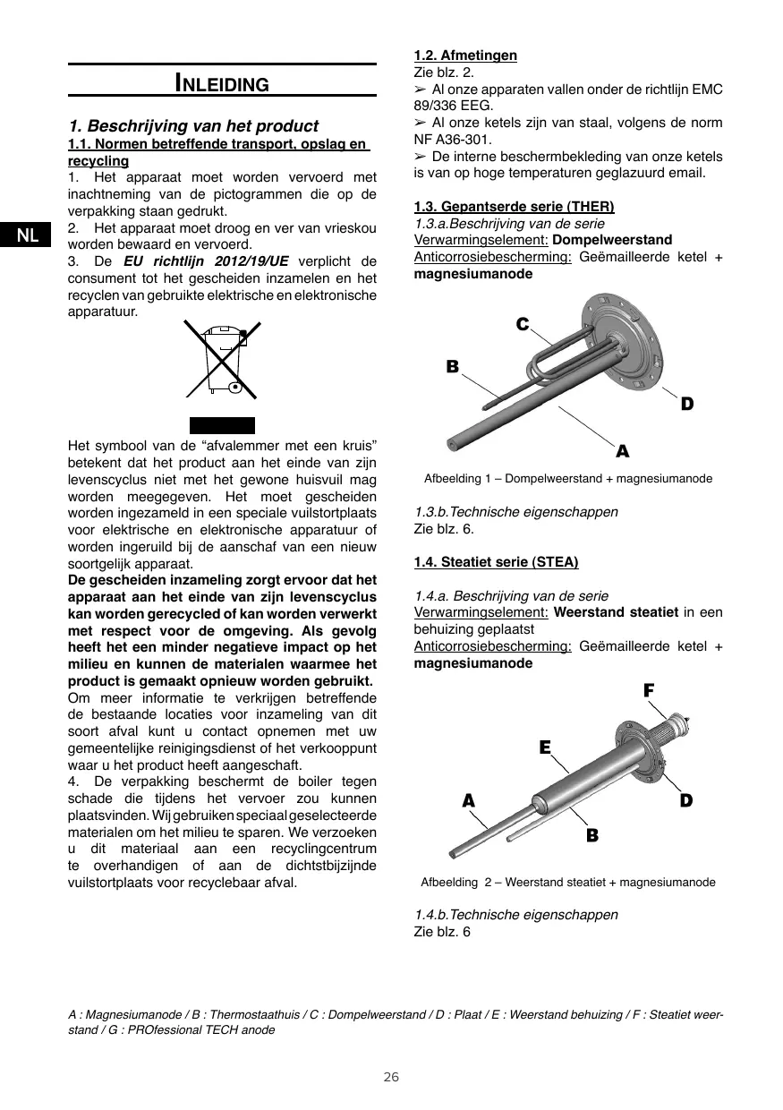 Verwarmingselement: Dompelweerstand Anticorrosiebescherming: Geëmailleerde ketel + magnesiumanode Het symbool van de “afvalemmer met een kruis” betekent dat het product aan het einde van zijn levenscyclus niet met het gewone huisvuil mag worden meegegeven. Het moet gescheiden worden ingezameld in een speciale vuilstortplaats voor elektrische en elektronische apparatuur of worden ingeruild bij de aanschaf van een nieuw soortgelijk apparaat. De gescheiden inzameling zorgt ervoor dat het apparaat aan het einde van zijn levenscyclus kan worden gerecycled of kan worden verwerkt met respect voor de omgeving. Als gevolg heeft het een minder negatieve impact op het milieu en kunnen de materialen waarmee het product is gemaakt opnieuw worden gebruikt. Om meer informatie te verkrijgen betreffende de bestaande locaties voor inzameling van dit soort afval kunt u contact opnemen met uw gemeentelijke reinigingsdienst of het verkooppunt waar u het product heeft aangeschaft.