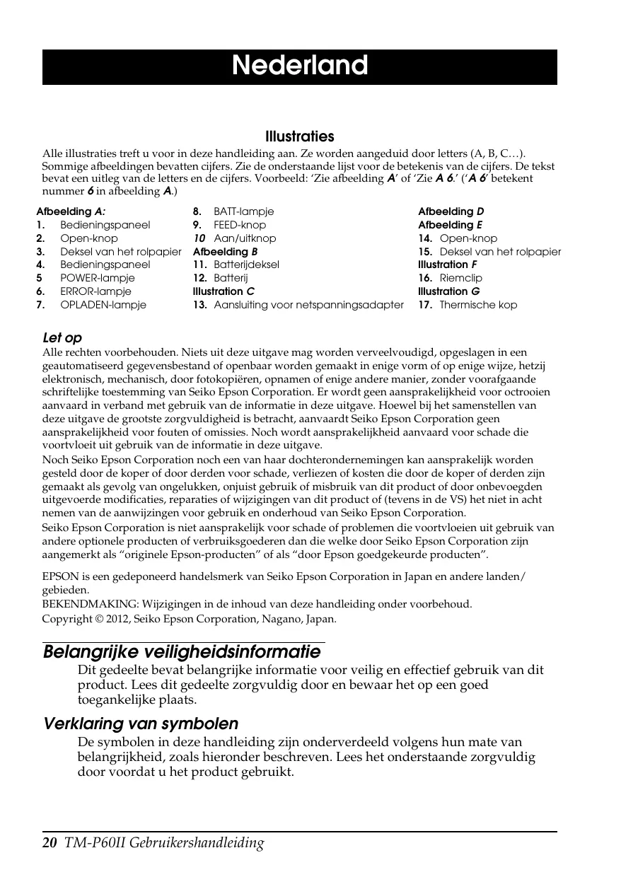 Nederland Illustraties Alle illustraties treft u voor in deze handleiding aan. Ze worden aangeduid door letters (A, B, C…). Sommige afbeeldingen bevatten cijfers. Zie de onderstaande lijst voor de betekenis van de cijfers. De tekst bevat een uitleg van de letters en de cijfers. Voorbeeld: ‘Zie afbeelding A’ of ‘Zie A 6.’ (‘A 6’ betekent nummer 6 in afbeelding A.) Afbeelding A: 1. Bedieningspaneel 2. Open-knop 3. Deksel van het rolpapier 4. Bedieningspaneel 5 POWER-lampje 6. ERROR-lampje 7. OPLADEN-lampje