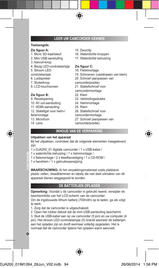 Lors du déballage, assurez-vous que les pièces suivantes soient incluses : 1 x Caméra numérique DJA200_01 / 1 x Câble USB / 1 x Boîtier étanche / 1 x Support de casque / 1 x Support de vélo / 2x fixation adhésive / 1 x CD-ROM / 1 x Dragonne / 1 x Notice d’utilisation AVERTISSEMENT : Tous les matériaux d’emballage, comme le scotch, les feuilles en plastiques, les ficelles et les étiquettes ne font pas partie du produit et doivent être jetés.