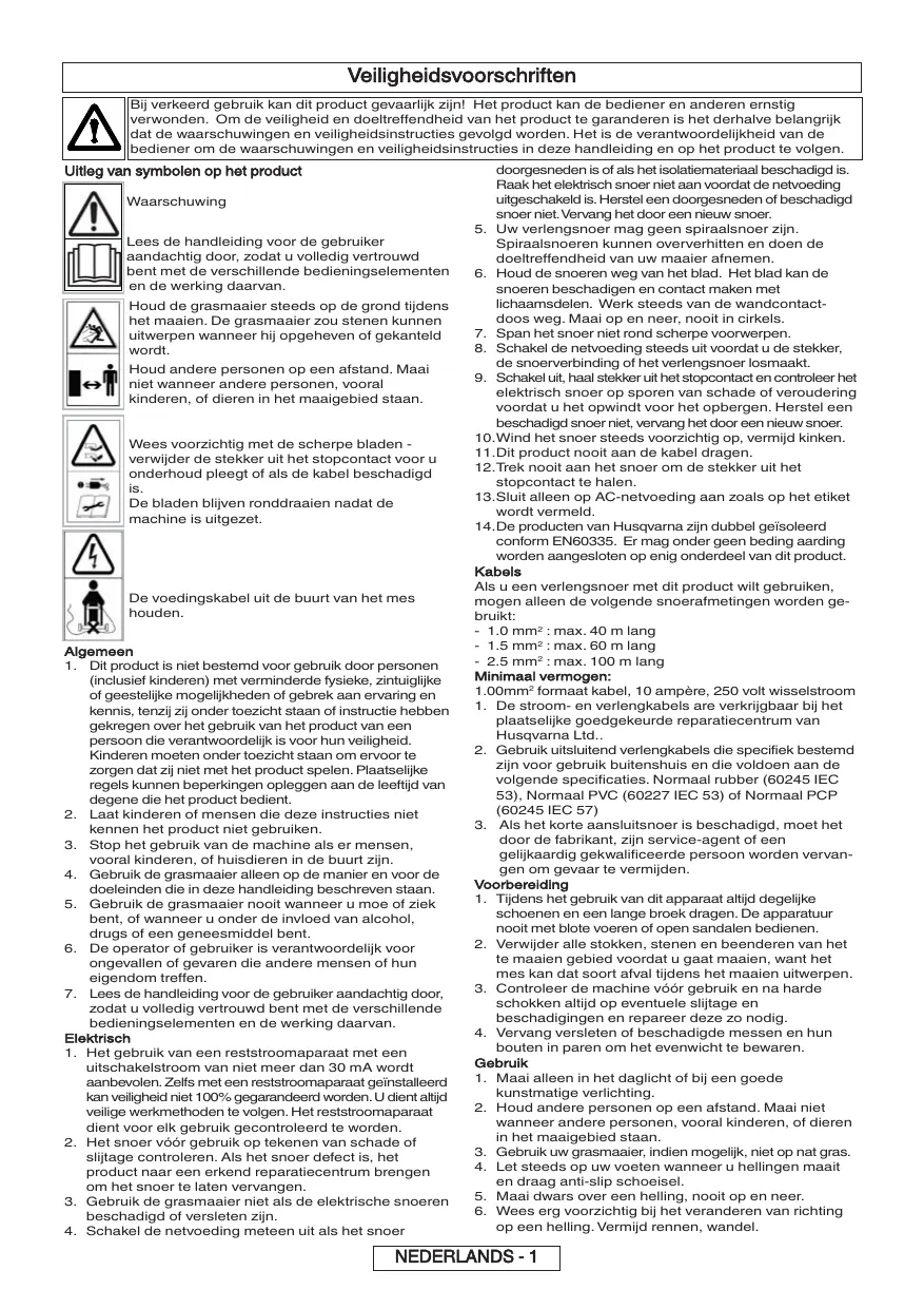 elektrisch snoer op sporen van schade of veroudering voordat u het opwindt voor het opbergen. Herstel een beschadigd snoer niet, vervang het door een nieuw snoer. 10.Wind het snoer steeds voorzichtig op, vermijd kinken. 11.Dit product nooit aan de kabel dragen. 12.Trek nooit aan het snoer om de stekker uit het stopcontact te halen. 13.Sluit alleen op AC-netvoeding aan zoals op het etiket wordt vermeld. 14.De producten van Husqvarna zijn dubbel geïsoleerd conform EN60335. Er mag onder geen beding aarding worden aangesloten op enig onderdeel van dit product. Kabels Als u een verlengsnoer met dit product wilt gebruiken, mogen alleen de volgende snoerafmetingen worden gebruikt: - 1.0 mm2 : max. 40 m lang - 1.5 mm2 : max. 60 m lang - 2.5 mm2 : max. 100 m lang Minimaal vermogen: 1.00mm2 formaat kabel, 10 ampère, 250 volt wisselstroom