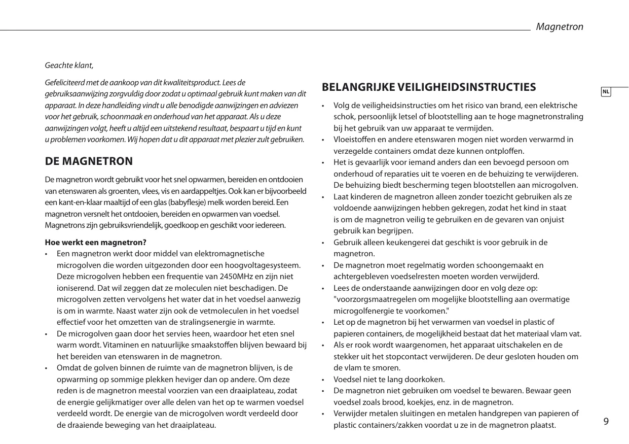 - Gebruik dit apparaat alleen voor het beoogde gebruik zoals beschreiben is in de handleiding. Gebruik geen bijtende chemicalien of gassen in dit apparaat. Deze magnetron is special ontworpen om voedsel te verwarmen. Het is Niet ontworpen voor industrieel gebruik of gebruik in een laboratorium.