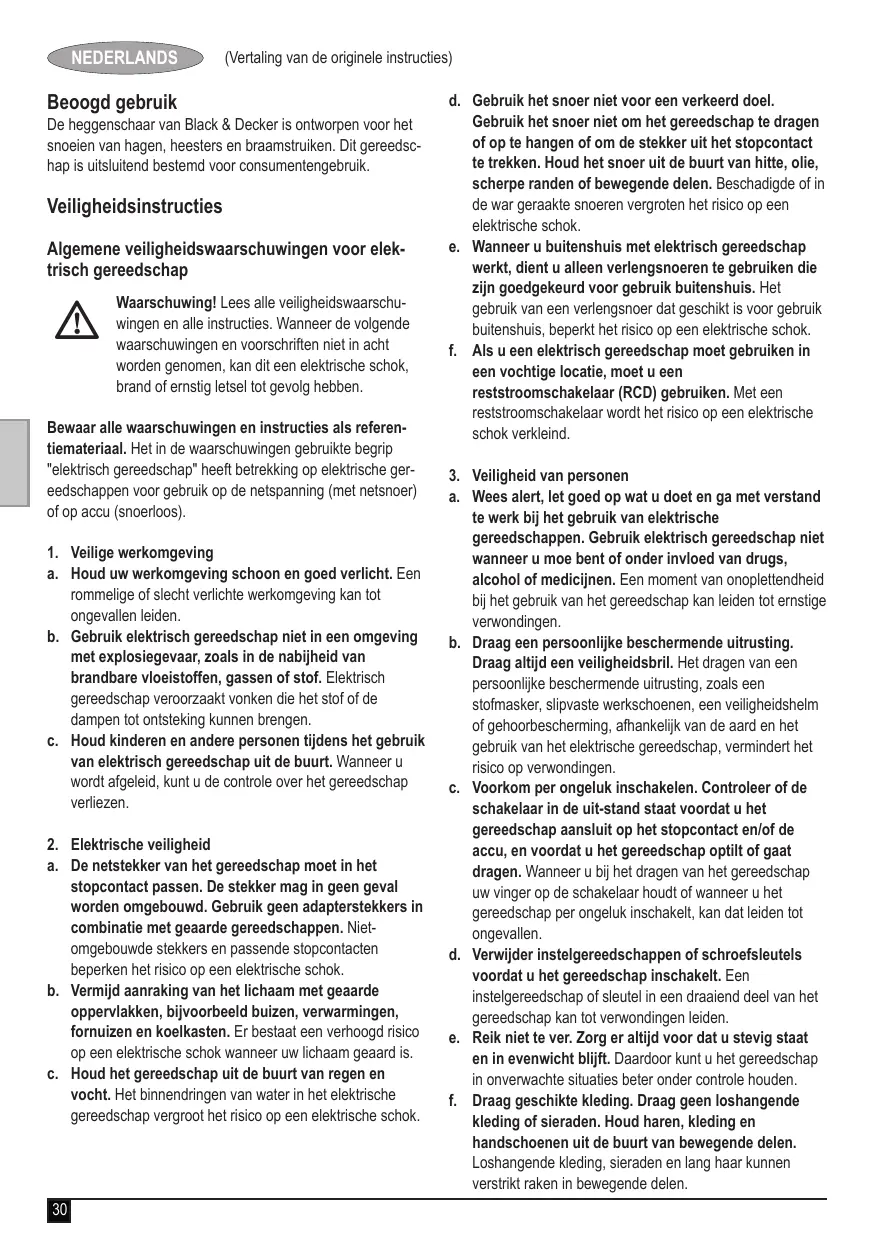 Als het netsnoer is beschadigd, moet dit worden vervangen door de fabrikant of een Black & Decker-servicecentrum om gevaren te voorkomen. Als u het gereedschap buitenshuis gebruikt, mag u alleen een verlengsnoer gebruiken dat geschikt is voor buitengebruik. U kunt een geschikte Black & Decker-verlengkabel van maximaal 30 m lang gebruiken zonder dat de prestaties afnemen. Verhoog de elektrische veiligheid eventueel verder met behulp van een hooggevoelige 30 mA reststroomschakelaar (RCD).