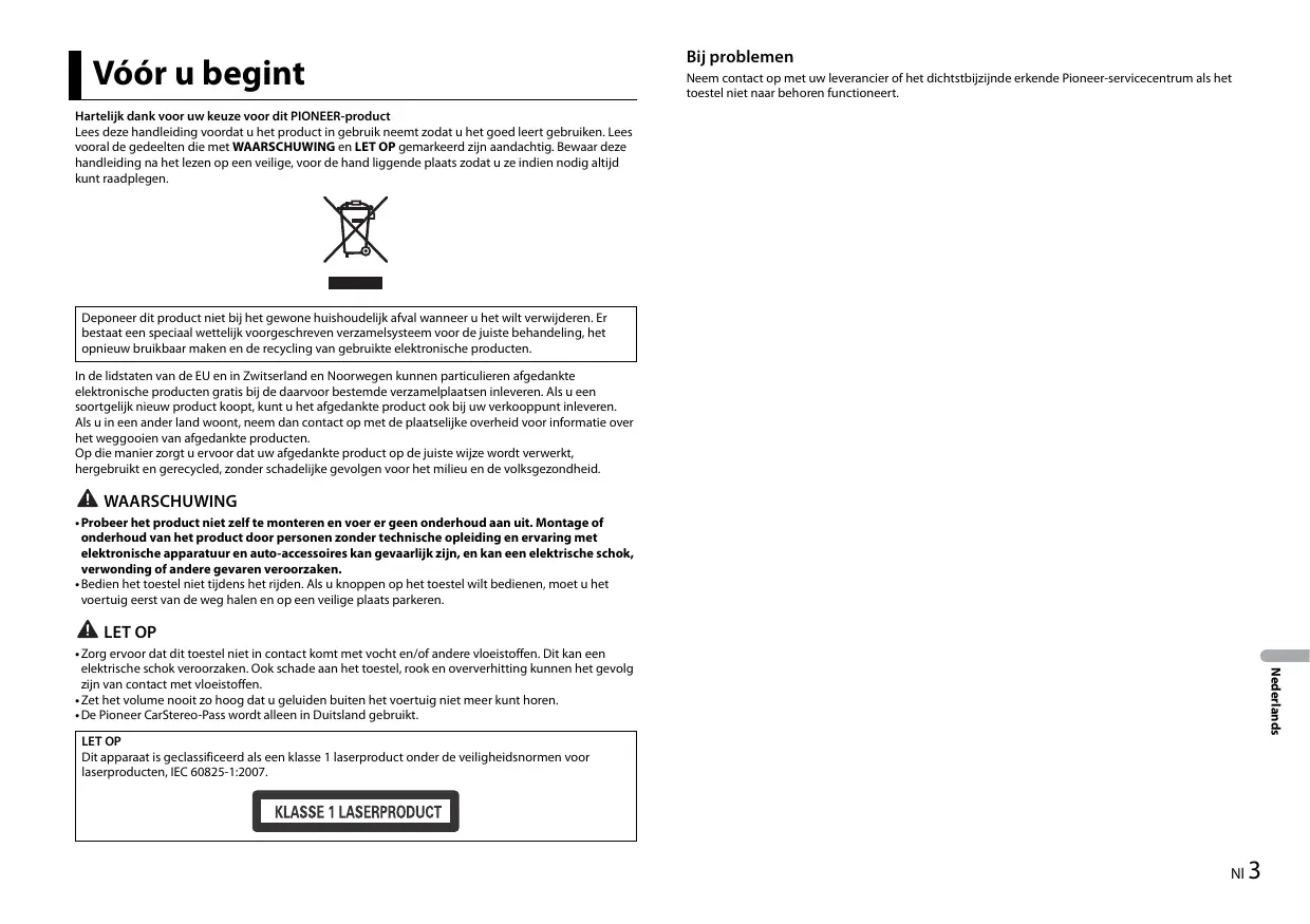 • Zorg ervoor dat dit toestel niet in contact komt met vocht en/of andere vloeistoffen. Dit kan een elektrische schok veroorzaken. Ook schade aan het toestel, rook en oververhitting kunnen het gevolg zijn van contact met vloeistoffen. • Zet het volume nooit zo hoog dat u geluiden buiten het voertuig niet meer kunt horen. • De Pioneer CarStereo-Pass wordt alleen in Duitsland gebruikt. LET OP Dit apparaat is geclassificeerd als een klasse 1 laserproduct onder de veiligheidsnormen voor laserproducten, IEC 60825-1:2007.