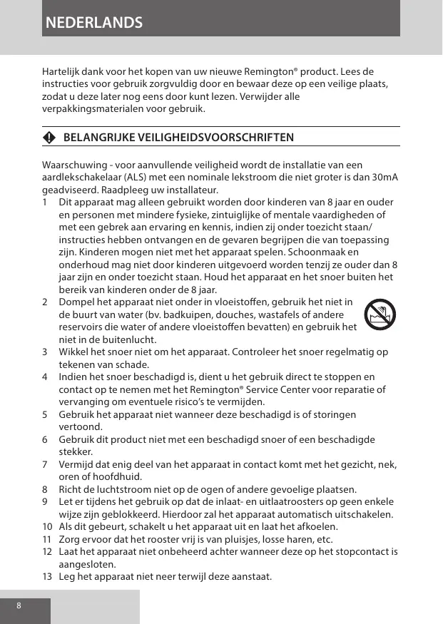 Waarschuwing - voor aanvullende veiligheid wordt de installatie van een aardlekschakelaar (ALS) met een nominale lekstroom die niet groter is dan 30mA geadviseerd. Raadpleeg uw installateur. 1 Dit apparaat mag alleen gebruikt worden door kinderen van 8 jaar en ouder en personen met mindere fysieke, zintuiglijke of mentale vaardigheden of met een gebrek aan ervaring en kennis, indien zij onder toezicht staan/ instructies hebben ontvangen en de gevaren begrijpen die van toepassing zijn. Kinderen mogen niet met het apparaat spelen. Schoonmaak en onderhoud mag niet door kinderen uitgevoerd worden tenzij ze ouder dan 8 jaar zijn en onder toezicht staan. Houd het apparaat en het snoer buiten het bereik van kinderen onder de 8 jaar. 2 Dompel het apparaat niet onder in vloeistoffen, gebruik het niet in de buurt van water (bv. badkuipen, douches, wastafels of andere reservoirs die water of andere vloeistoffen bevatten) en gebruik het niet in de buitenlucht. 3 Wikkel het snoer niet om het apparaat. Controleer het snoer regelmatig op tekenen van schade. 4 Indien het snoer beschadigd is, dient u het gebruik direct te stoppen en contact op te nemen met het Remington® Service Center voor reparatie of vervanging om eventuele risico’s te vermijden. 5 Gebruik het apparaat niet wanneer deze beschadigd is of storingen vertoond. 6 Gebruik dit product niet met een beschadigd snoer of een beschadigde stekker. 7 Vermijd dat enig deel van het apparaat in contact komt met het gezicht, nek, oren of hoofdhuid. 8 Richt de luchtstroom niet op de ogen of andere gevoelige plaatsen. 9 Let er tijdens het gebruik op dat de inlaat- en uitlaatroosters op geen enkele wijze zijn geblokkeerd. Hierdoor zal het apparaat automatisch uitschakelen. 10 Als dit gebeurt, schakelt u het apparaat uit en laat het afkoelen. 11 Zorg ervoor dat het rooster vrij is van pluisjes, losse haren, etc. 12 Laat het apparaat niet onbeheerd achter wanneer deze op het stopcontact is aangesloten. 13 Leg het apparaat niet neer terwijl deze aanstaat.