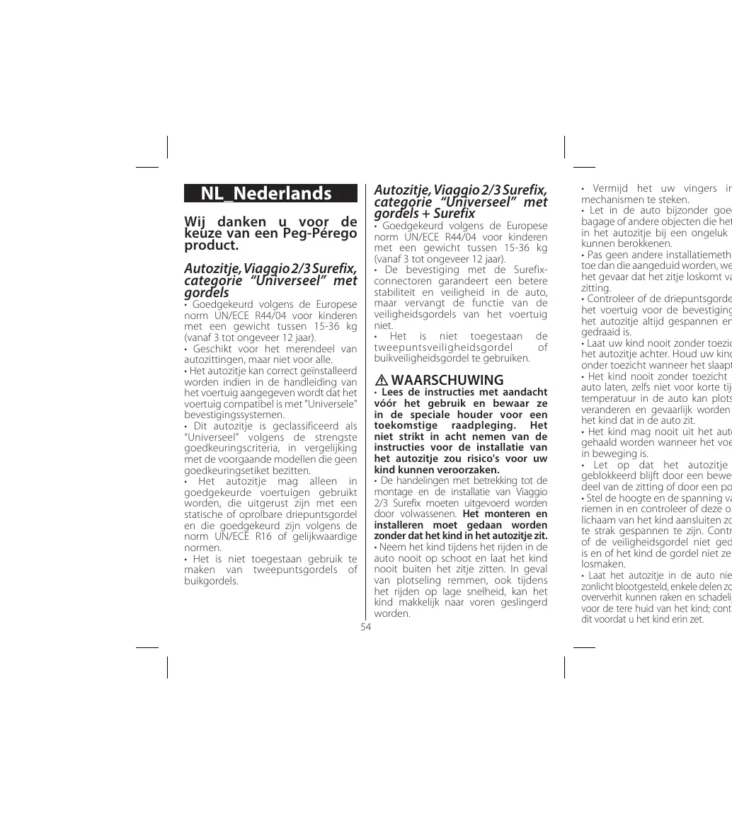 • Lees de instructies met aandacht vóór het gebruik en bewaar ze in de speciale houder voor een toekomstige raadpleging. Het niet strikt in acht nemen van de instructies voor de installatie van het autozitje zou risico's voor uw kind kunnen veroorzaken. • De handelingen met betrekking tot de montage en de installatie van Viaggio 2/3 Surefix moeten uitgevoerd worden door volwassenen. Het monteren en installeren moet gedaan worden zonder dat het kind in het autozitje zit. • Neem het kind tijdens het rijden in de auto nooit op schoot en laat het kind nooit buiten het zitje zitten. In geval van plotseling remmen, ook tijdens het rijden op lage snelheid, kan het kind makkelijk naar voren geslingerd worden. 54
