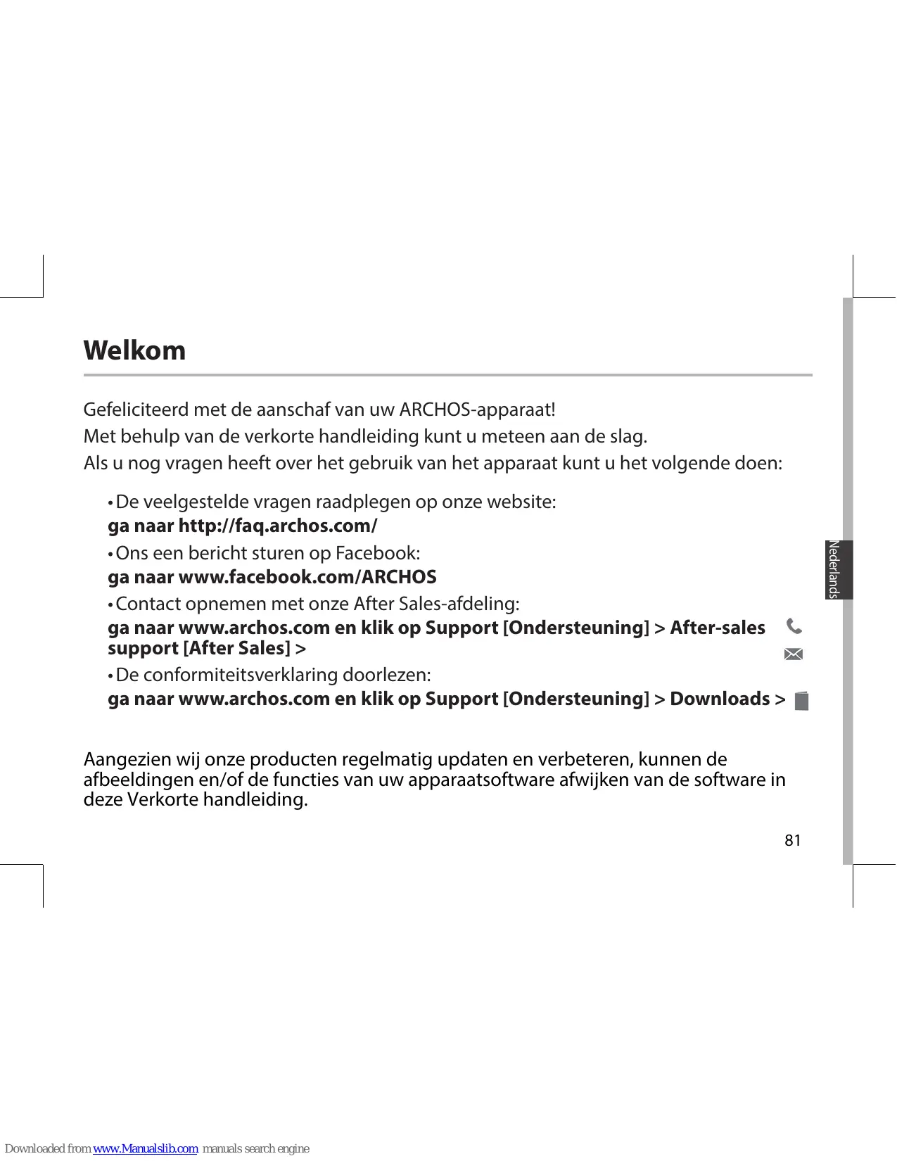 Si vous avez plus de questions concernant l’utilisation de votre appareil, • Vous pouvez consulter la foire aux questions sur notre site Web : allez sur http://faq.archos.com/ • Vous pouvez nous envoyer un message sur Facebook : allez sur www.facebook.com/ARCHOS • Vous pouvez contacter notre service après-vente : allez sur www.archos.com, cliquez sur Support > Service après-vente > • Vous pouvez consulter la déclaration de conformité : allez sur www.archos.com, cliquez sur Support > Téléchargements > Comme nous mettons à jour et améliorons régulièrement nos produits, le logiciel de votre appareil peut présenter une interface ou des fonctionnalités légèrement différentes de celles décrites dans ce guide. 17