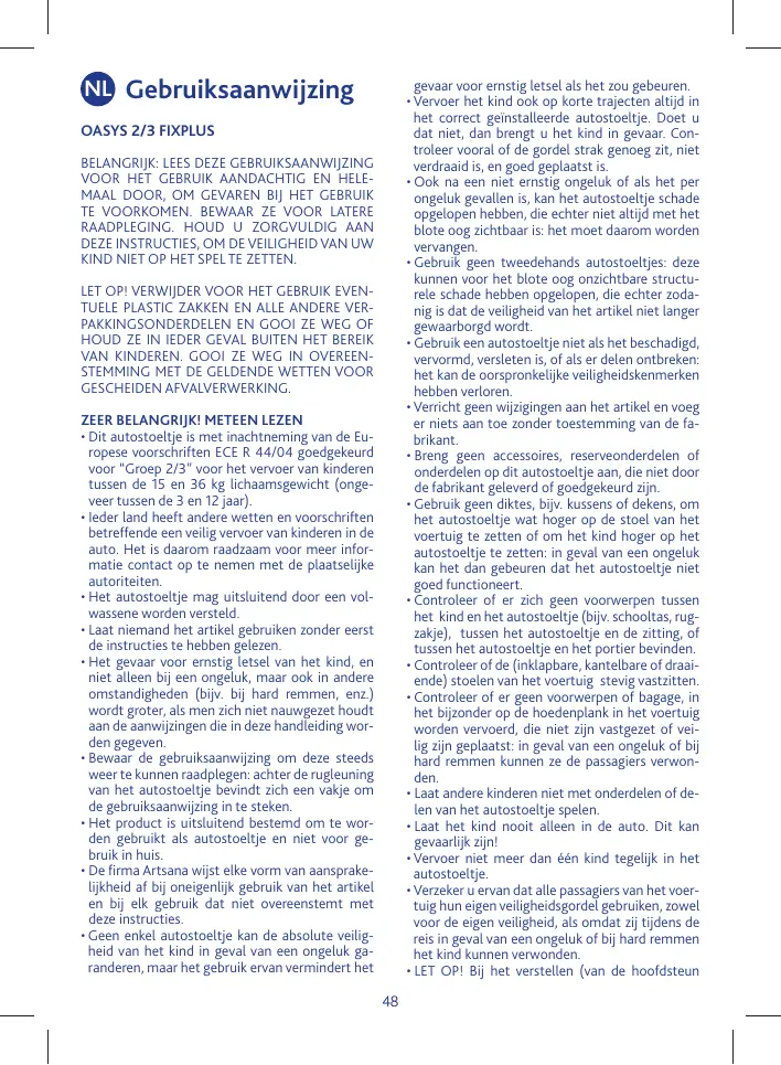 LIRE ATTENTIVEMENT ET ENTIÈREMENT CETTE NOTICE POUR ÉVITER TOUT DANGER ET LA CONSERVER POUR TOUTE RÉFÉRENCE FUTURE. POUR NE PAS COMPROMETTRE LA SÉCURITÉ DE VOTRE ENFANT, SUIVEZ ATTENTIVEMENT CES INSTRUCTIONS. ATTENTION ! AVANT D’UTILISER LE PRODUIT, ÔTER ET ÉLIMINER TOUS LES SACHETS EN PLASTIQUE ÉVENTUELS ET TOUS LES ÉLÉMENTS COMPOSANT L’EMBALLAGE DU PRODUIT ET LES TENIR HORS DE PORTÉE DES ENFANTS. IL EST CONSEILLÉ D’ÉLIMINER CES ÉLÉMENTS EN FAISANT LE TRI SÉLECTIF CONFORMÉMENT AUX LOIS EN VIGUEUR. TRÈS IMPORTANT ! À LIRE IMMÉDIATEMENT • Ce siège-auto est homologué “Groupe 2/3”, pour le transport d’enfants de 15 à 36 Kg (de 3 à 12 ans de façon indicative), conformément au règlement européen ECE R 44/04. • Chaque pays applique des lois et des règlements différents en matière de sécurité pour le transport des enfants en voiture. C’est pourquoi il est conseillé de contacter les autorités locales pour obtenir davantage d’informations. • Les activités de réglage du siège-auto doivent être effectuées exclusivement par un adulte. • Éviter que quiconque utilise le produit sans avoir lu la notice. • Le risque de blessures de l’enfant, non seulement en cas d’accident mais aussi dans d’autres circonstances (par ex. freinages brusques, etc.) augmente si les indications de cette notice ne sont pas suivies scrupuleusement. • Conserver la Notice pour toute référence future : une poche permettant de ranger la notice se trouve derrière le dossier du siège auto. • Le produit doit être utilisé exclusivement comme siège-auto et ne doit pas être utilisé à la maison. • La société Artsana décline toute responsabilité en cas d’utilisation incorrecte du produit et pour toute utilisation différente de cette notice. • Aucun siège-auto ne peut garantir la sécurité totale de l’enfant en cas d’accident, mais son utilisation réduit le risque de blessures graves. • Transporter un enfant dans un siège-auto correctement installé, même lors de trajets brefs ; dans le cas contraire, cela pourrait nuire à sa sécurité. Vérifier notamment que la ceinture est correcte-