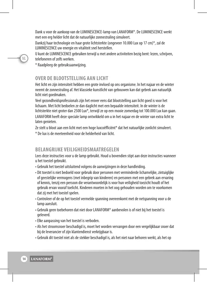 NL Dank u voor de aankoop van de LUMINESCENCE-lamp van LANAFORM®. De LUMINESCENCE werkt met een erg helder licht dat de natuurlijke zonnestraling simuleert. Dankzij haar technologie en haar grote lichtsterkte (ongeveer 10.000 Lux op 17 cm)*, zal de LUMINESCENCE uw energie en vitaliteit snel herstellen. U kunt de LUMINESCENCE gebruiken terwijl u met andere activiteiten bezig bent: lezen, schrijven, telefoneren of zelfs werken. * Raadpleeg de gebruiksaanwijzing.