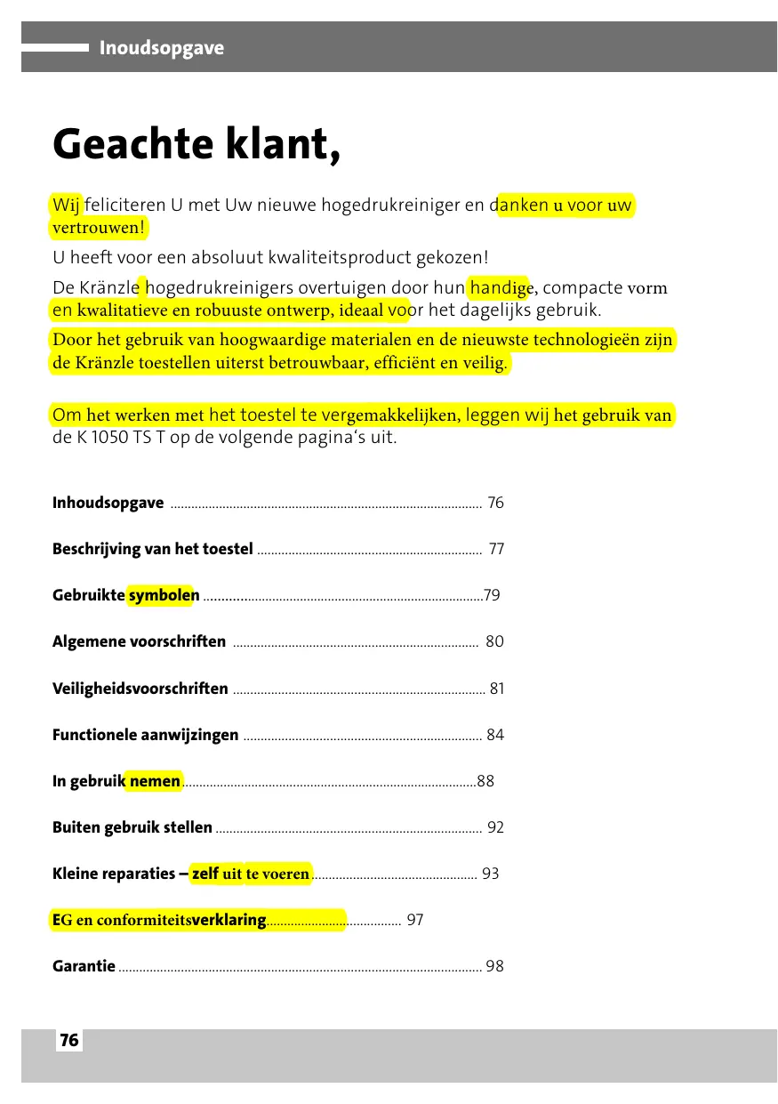 - Inoudsopgave Geachte klant, Wij feliciteren U met Uw nieuwe hogedrukreiniger en danken u voor uw vertrouwen! U heeft voor een absoluut kwaliteitsproduct gekozen! De Kränzle hogedrukreinigers overtuigen door hun handige, compacte vorm en kwalitatieve en robuuste ontwerp, ideaal voor het dagelijks gebruik. Door het gebruik van hoogwaardige materialen en de nieuwste technologieën zijn de Kränzle toestellen uiterst betrouwbaar, efficiënt en veilig. Om het werken met het toestel te vergemakkelijken, leggen wij het gebruik van de K 1050 TS T op de volgende pagina‘s uit. Inhoudsopgave p. 76