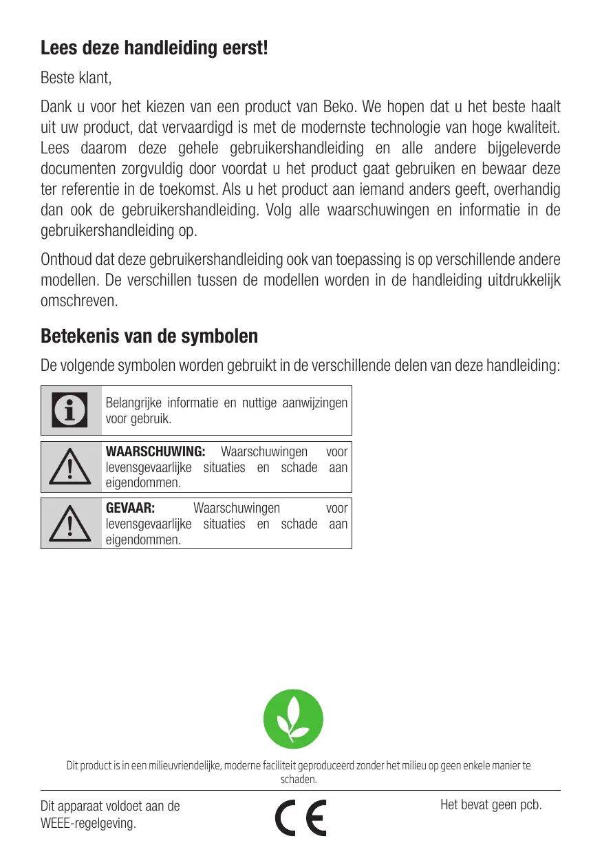 Dank u voor het kiezen van een product van Beko. We hopen dat u het Beste haaltuit uw product, dat vervaardigd is met de modernste technologie van hoch kwaliteit. Lees waarom deze gehele gebruikershandleiding en alle andere bijgeleverde documenten zorgvuldig door voordat u het product gaat gebruiken en bewaar deze ter referentie in de toekomst. Als u het product aan iemand anders geeft, overhandig dan ook de gebruikershandleiding. Volg alle waarschuwingen en informatie in de gebruikershandleiding op.
