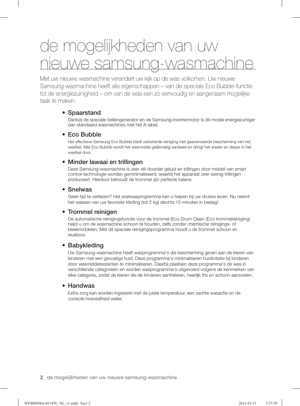 - Handwas Extra zorg kan worden ingesteld met de juiste temperatuur, een zachte wasactie en de correcte hoeveelheid water. 2_ de mogelijkheden van uw nieuwe samsung-wasmachine WF906P4SA-03147G_NL_v1.indd Sec1:2 2012-03-15 5:37:59