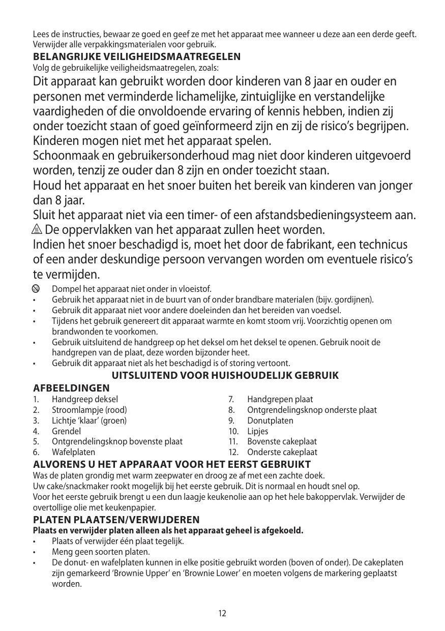 être effectués par des enfants, à moins qu’ils ne soient âgés de plus de 8 ans et qu’ils soient supervisés. Tenez l’appareil et le câble hors de portée des enfants de moins de 8 ans. Veillez à ne pas connecter l’appareil via une minuterie ou un système de télécommande. h Les surfaces de l’appareil vont s’échauffer. Si le câble est abîmé, vous devez le faire remplacer par le fabricant, un de ses techniciens agréés ou une personne également qualifiée, pour éviter tout danger. b • • • Utilisez cet appareil exclusivement pour la cuisson d’aliments. Cet appareil produit de la chaleur et dégage de la vapeur pendant son utilisation. Ouvrez-le avec précaution afin d’éviter les brûlures/ébouillantements. Utilisez uniquement la poignée du couvercle pour ouvrir le couvercle. N’utilisez en aucun cas les poignées des plaques étant donné qu’elles peuvent être brûlantes. N’utilisez pas cet appareil s’il est endommagé ou ne fonctionne pas correctement.