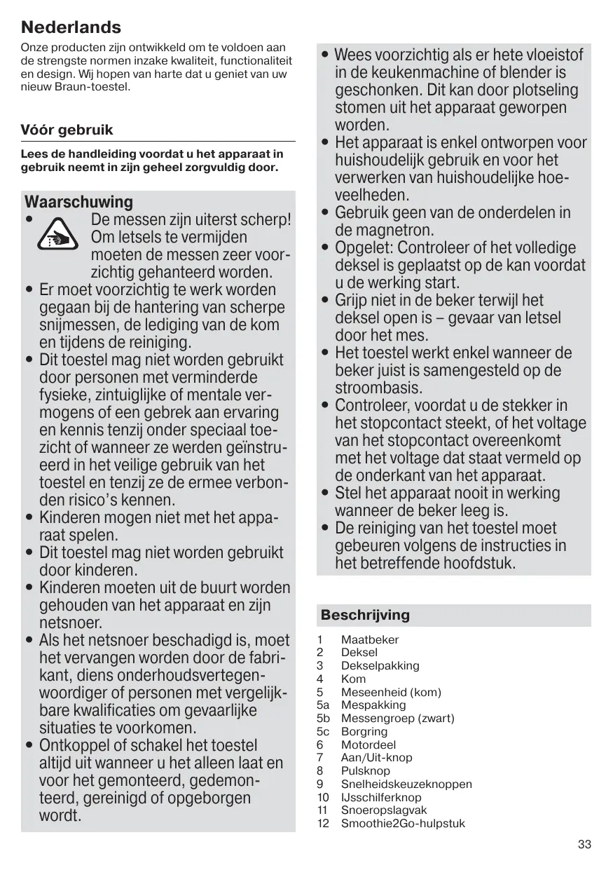 Assurez-vous que le pichet est vide avant de dévisser la bague de verrouillage. Manipulez la lame avec précaution. • Toutes les pièces amovibles, y compris les accessoires Smoothie2Go, passent au lavevaisselle. N’utilisez pas le programme de stérilisation. Le cycle de stérilisation pourrait endommager votre produit. • Les pièces peuvent également être lavées à l’eau chaude savonneuse. Rincez et séchez soigneusement. • Pour un nettoyage efficace des couvercles et des lames, retirez les joints (3/12b, 5a/13a). Ne jetez pas ce produit avec les ordures menageres lorsqu’il est en fin de vie. Le remettre a un centre service agree Braun ou le deposer dans des sites de recuperation appropries conformement aux reglementations locales ou nationales en vigueur. Les matériaux et les objets destinés à être en contact avec les produits alimentaires sont conformes aux prescriptions du règlement européen 1935/2004.