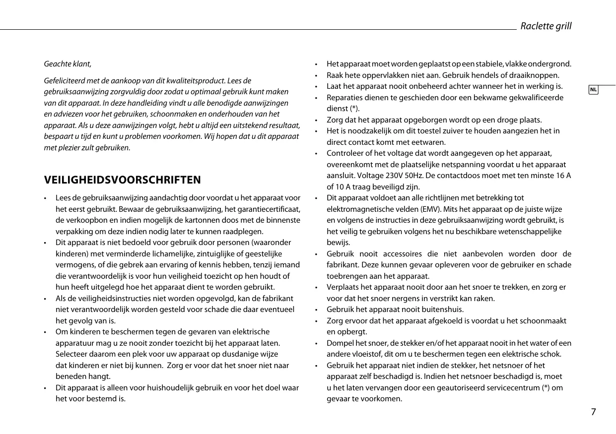 Het apparaat moet worden geplaatst op een stabiele, vlakke ondergrond. Raak hete oppervlakken niet aan. Gebruik hendels of draaiknoppen. Laat het apparaat nooit onbeheerd achter wanneer het in werking is. Reparaties dienen te geschieden door een bekwame gekwalificeerde dienst (*). Zorg dat het apparaat opgeborgen wordt op een droge plaats. Het is noodzakelijk om dit toestel zuiver te houden aangezien het in direct contact komt met eetwaren. Controleer of het voltage dat wordt aangegeven op het apparaat, overeenkomt met de plaatselijke netspanning voordat u het apparaat aansluit. Voltage 230V 50Hz. De contactdoos moet met ten minste 16 A of 10 A traag beveiligd zijn. Dit apparaat voldoet aan alle richtlijnen met betrekking tot elektromagnetische velden (EMV). Mits het apparaat op de juiste wijze en volgens de instructies in deze gebruiksaanwijzing wordt gebruikt, is het veilig te gebruiken volgens het nu beschikbare wetenschappelijke bewijs. Gebruik nooit accessoires die niet aanbevolen worden door de fabrikant. Deze kunnen gevaar opleveren voor de gebruiker en schade toebrengen aan het apparaat. Verplaats het apparaat nooit door aan het snoer te trekken, en zorg er voor dat het snoer nergens in verstrikt kan raken. Gebruik het apparaat nooit buitenshuis. Zorg ervoor dat het apparaat afgekoeld is voordat u het schoonmaakt en opbergt. Dompel het snoer, de stekker en/of het apparaat nooit in het water of een andere vloeistof, dit om u te beschermen tegen een elektrische schok. Gebruik het apparaat niet indien de stekker, het netsnoer of het apparaat zelf beschadigd is. Indien het netsnoer beschadigd is, moet u het laten vervangen door een geautoriseerd servicecentrum (*) om gevaar te voorkomen.