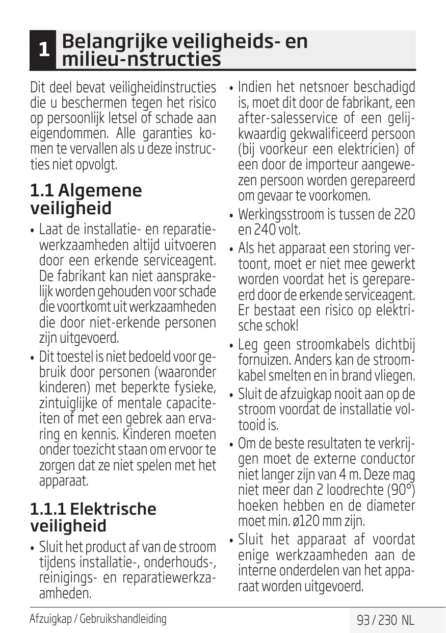 het netsnoer beschadigd is, moet dit door de fabrikant, een after-salesservice of een gelijkwaardig gekwalificeerd persoon (bij voorkeur een elektricien) of een door de importeur aangewezen persoon worden gerepareerd om gevaar te voorkomen. •• Werkingsstroom is tussen de 220 en 240 volt. •• Als het apparaat een storing vertoont, moet er niet mee gewerkt worden voordat het is gerepareerd door de erkende serviceagent. Er bestaat een risico op elektrische schok! •• Leg geen stroomkabels dichtbij fornuizen. Anders kan de stroomkabel smelten en in brand vliegen. •• Sluit de afzuigkap nooit aan op de stroom voordat de installatie voltooid is. •• Om de beste resultaten te verkrijgen moet de externe conductor niet langer zijn van 4 m. Deze mag niet meer dan 2 loodrechte (90°) hoeken hebben en de diameter moet min. ø120 mm zijn. •• Sluit het apparaat af voordat enige werkzaamheden aan de interne onderdelen van het apparaat worden uitgevoerd. 93 / 230 NL