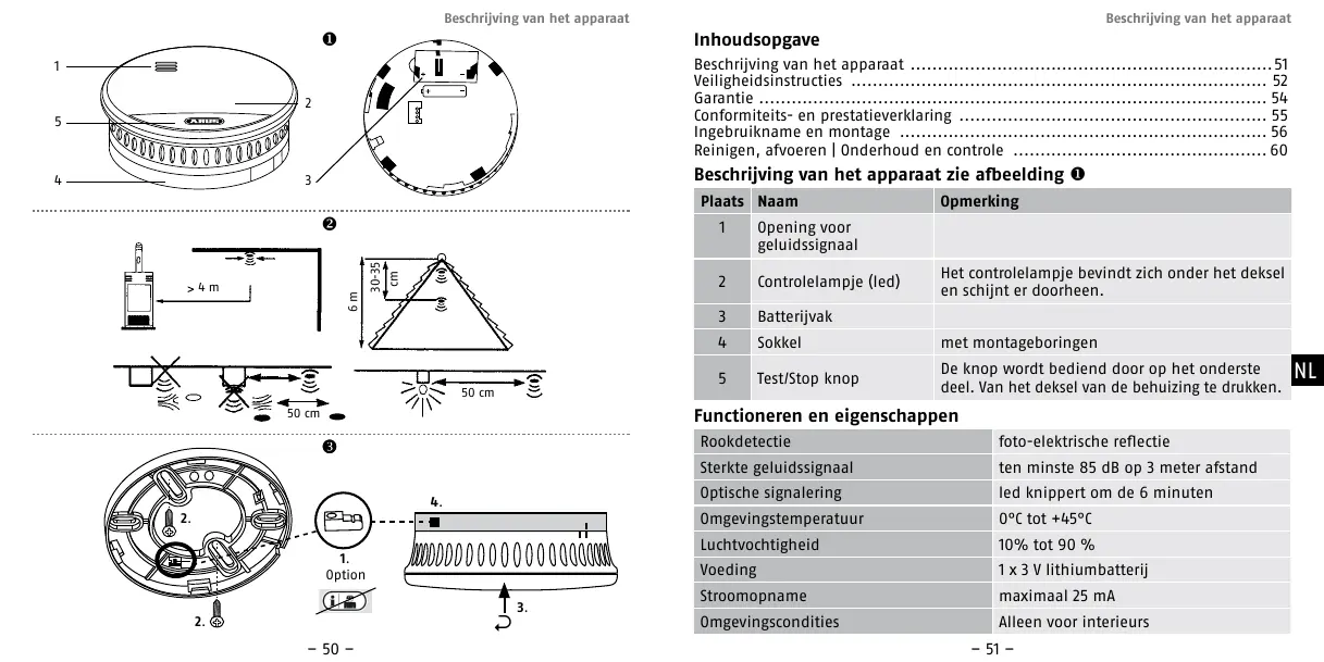 Rookdetectie foto-elektrische reflectie Sterkte geluidssignaal ten minste 85 dB op 3 meter afstand Optische signalering led knippert om de 6 minuten Omgevingstemperatuur 0°C tot +45°C Luchtvochtigheid 10% tot 90 % Voeding 1 x 3 V lithiumbatterij Stroomopname maximaal 25 mA Omgevingscondities Alleen voor interieurs – 51 –