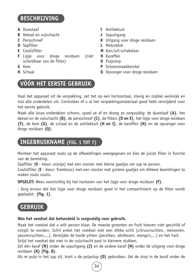 Haal het apparaat uit de verpakking, zet het op een horizontaal, stevig en stabiel werkvlak en stal alle onderdelen uit. Controleer of u al het verpakkingsmateriaal goed hebt verwijderd voor het eerste gebruik. Maak alle losse onderdelen schoon, spoel ze af en droog ze zorgvuldig: de duwstaaf (A), het deksel en de vulschacht (B), de persschroef (C), de filters (D en E), het lipje voor droge residuen (F), de kom (G), de schaal en de antilektuit (H en I), de karaffen (N) en de opvanger voor droge residuen (Q). INGEBRUIKNAME (FIG. 1 TOT 7) Monteer het apparaat zoals op de afbeeldingen weergegeven en kies de juiste filter in functie van de bereiding: Sapfilter (D - kleur: oranje) met een rooster met kleine gaatjes om sap te persen. Coulisfilter (E - kleur: framboos) met een rooster met grotere gaatjes om dikkere bereidingen te maken zoals coulis. OPGELET: Wees voorzichtig bij het hanteren van het lipje voor droge residuen (F). - Zorg ervoor dat het lipje voor droge residuen goed in het compartiment op de filter wordt geplaatst. (fig. 1). GEBRUIK Was het voedsel dat behandeld is zorgvuldig voor gebruik. Maak het voedsel dat u wilt persen klaar. De meeste groenten en fruit hoeven niet geschild of ontpit te worden. Schil enkel het voedsel met een dikke schil (citrusvruchten, meloenen, passievruchten,...). Verwijder de harde pitten (perziken, abrikozen, mango's,...) en het hart. Snijd het voedsel dat niet in de vulschacht past in kleinere stukken. Zet één karaf (N) onder de sapuitgang (J) en de andere karaf (N) onder de uitgang voor droge residuen (K) (fig. 8). Als er pulp in het sap zit, kunt u de pulpstop (O) gebruiken. Zet de stop in de karaf onder de
