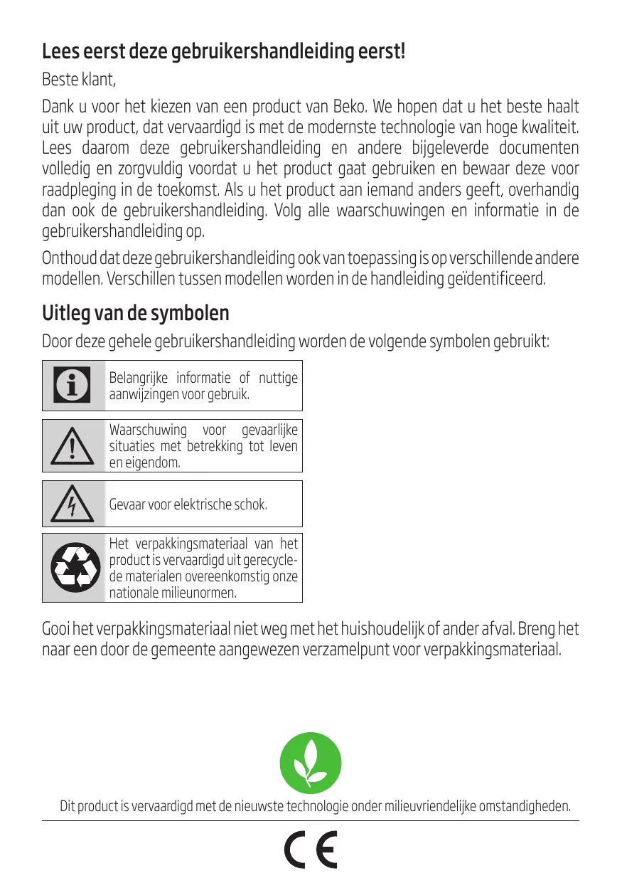 Dank u voor het kiezen van een product van Beko. We hopen dat u het Beste haaltuit uw product, dat vervaardigd is met de modernste technologie van hoch kwaliteit. Lees waarom deze gebruikershandleiding en andere bijgeleverde documenten volledig en zorgvuldig voordat u het product gaat gebruiken enbewaar deze voor raadpleging in de toekomst. Als u het product aan iemand anders geeft, overhandig dan ook de gebruikershandleiding. Volg alle waarschuwingen en informatie in de gebruikershandleiding op.