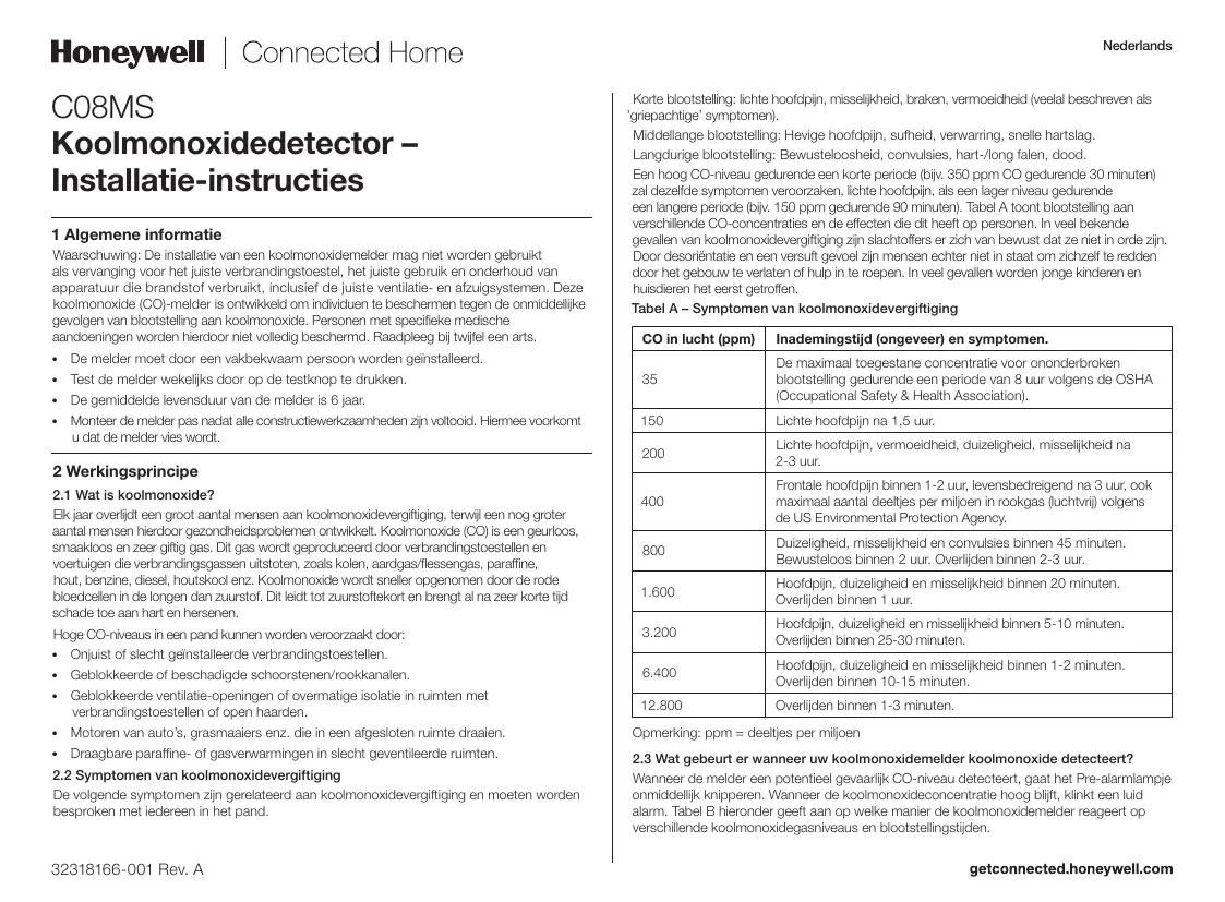 32318166-001 Rev. A C08MS Koolmonoxidedetector – Installatie-instructies