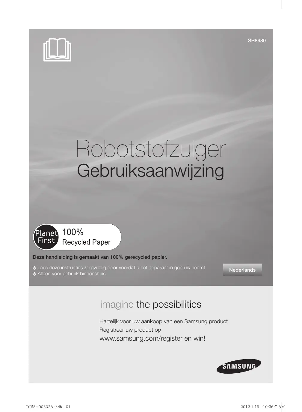 Some software components of this product incorporate source code covered under the BSD. And this software is based in part on the work of the Independent JPEG Group. ■ OpenCV : IMPORTANT : READ BEFORE DOWNLOADING, COPYING, INSTALLING OR USING. By downloading, copying, installing or using the software you agree to this license. If you do not agree to this license, do not download, install, copy or use the software. License Agreement For Open Source Computer Vision Library Copyright (C) 2000-2008, Intel Corporation, all rights reserved. Copyright (C) 2008-2010, Willow Garage Inc., all rights reserved. Third party copyrights are property of their respective owners. Redistribution and use in source and binary forms, with or without modification, are permitted provided that the following conditions are met: Redistribution’s of source code must retain the above copyright notice, this list of conditions and the following disclaimer. Redistribution’s in binary form must reproduce the above copyright notice, this list of conditions and the following disclaimer in the documentation and/or other materials provided with the distribution. The name of the copyright holders may not be used to endorse or promote products derived from this software without specific prior written permission. This software is provided by the copyright holders and contributors “as is” and any express or implied warranties, including, but not limited to, the implied warranties of merchantability and fitness for a particular purpose are disclaimed. In no event shall the Intel Corporation or contributors be liable for any direct, indirect, incidental, special, exemplary, or consequential damages (including, but not limited to, procurement of substitute goods or services; loss of use, data, or profits; or business interruption) however caused and on any theory of liability, whether in contract, strict liability, or tort (including negligence or otherwise) arising in any way out of the use of this software, even if advised of the possibility of such damage. ■ Copyright (c) 2006, 2008, 2009, 2010 Edward Rosten All rights reserved. Redistribution and use in source and binary forms, with or without modification, are permitted provided that the following conditions are met: Redistributions of source code must retain the above copyright notice, this list of conditions and the following disclaimer. Redistributions in binary form must reproduce the above copyright notice, this list of conditions and the following disclaimer in the documentation and/or other materials provided with the distribution. Neither the name of the University of Cambridge nor the names of its contributors may be used to endorse or promote products derived from this software without specific prior written permission. THIS SOFTWARE IS PROVIDED BY THE COPYRIGHT HOLDERS AND CONTRIBUTORS “AS IS” AND ANY EXPRESS OR IMPLIED WARRANTIES, INCLUDING, BUT NOT LIMITED TO, THE IMPLIED WARRANTIES OF MERCHANTABILITY AND FITNESS FOR A PARTICULAR PURPOSE ARE DISCLAIMED. IN NO EVENT SHALL THE COPYRIGHT OWNER OR CONTRIBUTORS BE LIABLE FOR ANY DIRECT, INDIRECT, INCIDENTAL, SPECIAL, EXEMPLARY, OR CONSEQUENTIAL DAMAGES (INCLUDING, BUT NOT LIMITED TO, PROCUREMENT OF SUBSTITUTE GOODS OR SERVICES; LOSS OF USE, DATA, OR PROFITS; OR BUSINESS INTERRUPTION) HOWEVER CAUSED AND ON ANY THEORY OF LIABILITY, WHETHER IN CONTRACT, STRICT LIABILITY, OR TORT (INCLUDING NEGLIGENCE OR OTHERWISE) ARISING IN ANY WAY OUT OF THE USE OF THIS SOFTWARE, EVEN IF ADVISED OF THE POSSIBILITY OF SUCH DAMAGE. DJ68-00632A.indb 52 2012.1.19 10:36:6 AM memo DJ68-00632A.indb 53 2012.1.19 10:36:7 AM memo DJ68-00632A.indb 54 2012.1.19 10:36:7 AM memo DJ68-00632A.indb 55 2012.1.19 10:36:7 AM DJ68-00632A.indb 56 2012.1.19 10:36:7 AM SR8980 Robotstofzuiger Gebruiksaanwijzing Deze handleiding is gemaakt van 100% gerecycled papier. ✻ Lees deze instructies zorgvuldig door voordat u het apparaat in gebruik neemt. ✻ Alleen voor gebruik binnenshuis. Nederlands imagine the possibilities Hartelijk voor uw aankoop van een Samsung product. Registreer uw product op www.samsung.com/register en win! DJ68-00632A.indb 01 2012.1.19 10:36:7 AM veiligheidsinformatie VEILIGHEIDSINFORMATIE