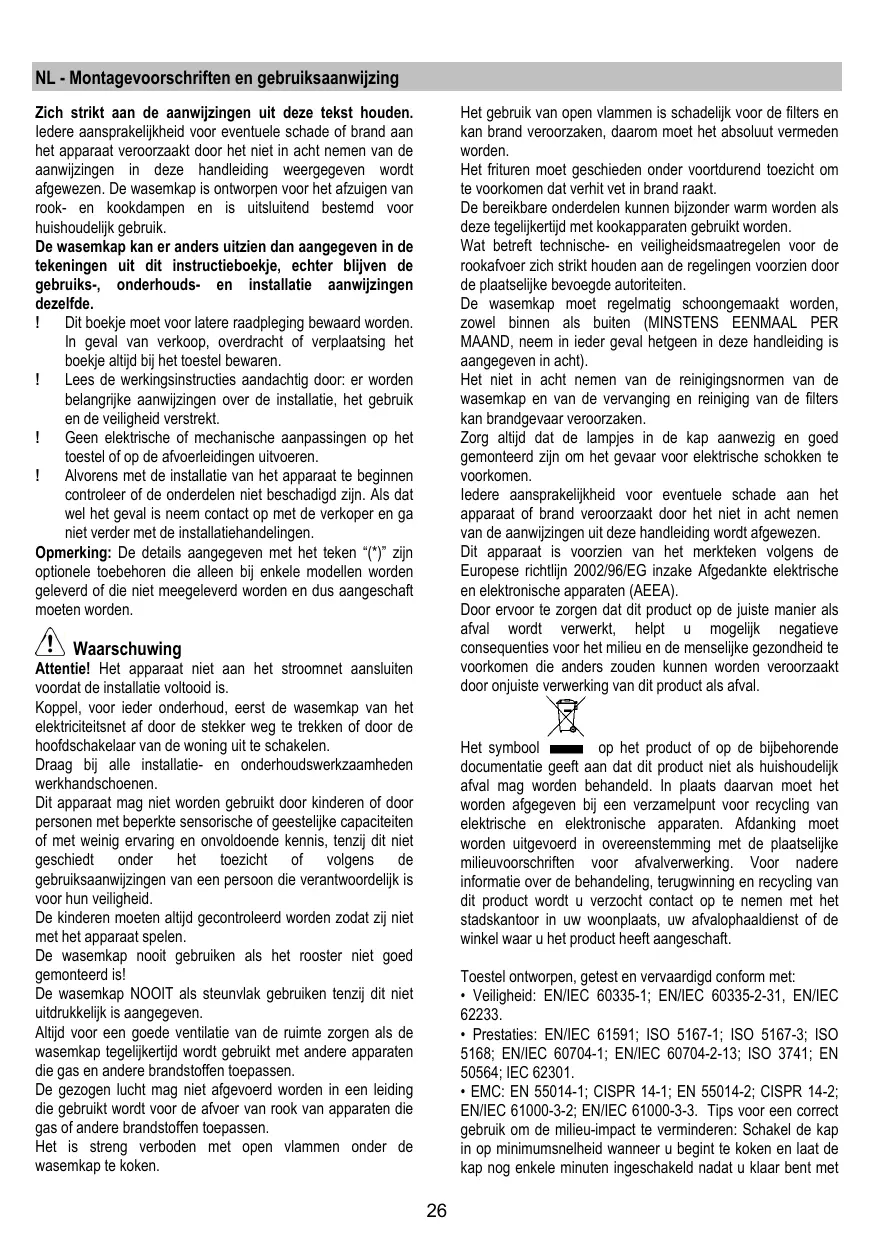 Montaje y modo de empleo Instruções para montagem e utilização Ο∆ΗΓΙΕΣ ΣΥΝΑΡΜΟΛΟΓΗΣΗΣ ΚΑΙ ΧΡΗΣΗΣ Monterings- och bruksanvisningar éviter à tout prix. La friture d’aliments doit être réalisée sous contrôle pour éviter que l’huile surchauffée ne prenne feu. Les pièces accessibles peuvent se réchauffer de façon importante quand elles sont utilisées avec des appareils pour la cuisson. En ce qui concerne les mesures techniques et de sécurité à adopter pour l’évacuation des fumées, s’en tenir strictement à ce qui est prévu dans les règlements des autorités locales compétentes. La hotte doit être régulièrement nettoyée, aussi bien à l’intérieur qu’à l’extérieur (AU MOINS UNE FOIS PAR MOIS, respecter néanmoins les instructions relatives à l’entretien fournies dans ce manuel). La non observation de ces normes de nettoyage de la hotte et du changement et nettoyage des filtres comporte des risques d’incendie. Ne pas utiliser ou laisser la hotte sans que les ampoules soient correctement placées pour éviter tout risque de choc électrique. La société décline toute responsabilité pour d’éventuels inconvénients, dégâts ou incendies provoqués par l’appareil et dérivés de la non observation des instructions reprises dans ce manuel. Cet appareil porte le symbole du recyclage conformément à la Directive Européenne 2002/96/CE concernant les Déchets d’Équipements Électriques et Électroniques (DEEE ou WEEE). En procédant correctement à la mise au rebut de cet appareil, vous contribuerez à empêcher toute conséquence nuisible pour l’environnement et la santé de l’homme.