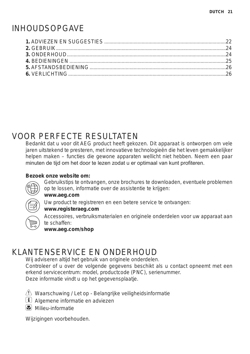 Wij adviseren altijd het gebruik van originele onderdelen. Controleer of u over de volgende gegevens beschikt als u contact opneemt met een erkend servicecentrum: model, productcode (PNC), serienummer. Deze informatie vindt u op het gegevensplaatje. Waarschuwing / Let op - Belangrijke veiligheidsinformatie Algemene informatie en adviezen Milieu-informatie Wijzigingen voorbehouden. 22 www.aeg.com