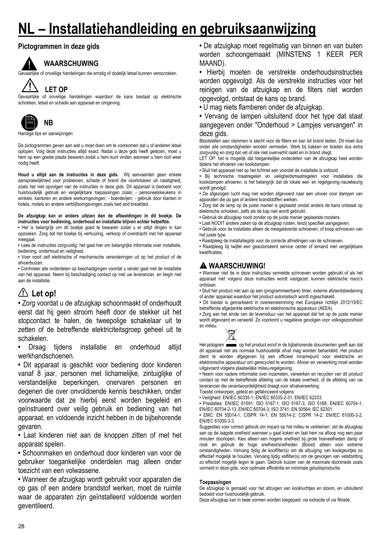 NB Handige tips en aanwijzingen De pictogrammen geven aan wat u moet doen om te voorkomen dat u of anderen letsel oplopen. Volg deze instructies altijd exact. Nadat u deze gids heeft gelezen, moet u hem op een goede plaats bewaren zodat u hem kunt vinden wanneer u hem ooit weer nodig heeft. Houd u altijd aan de instructies in deze gids. Wij aanvaarden geen enkele aansprakelijkheid voor problemen, schade of brand die voortvloeien uit nalatigheid, zoals het niet opvolgen van de instructies in deze gids. Dit apparaat is bedoeld voor huishoudelijk gebruik en vergelijkbare toepassingen zoals: - personeelskeukens in winkels, kantoren en andere werkomgevingen; - boerderijen; - gebruik door klanten in hotels, motels en andere verblijfsomgevingen zoals bed and breakfast. De afzuigkap kan er anders uitzien dan de afbeeldingen in dit boekje. De instructies voor bediening, onderhoud en installatie blijven echter hetzelfde. • Het is belangrijk om dit boekje goed te bewaren zodat u er altijd dingen in kan opzoeken. Zorg dat het boekje bij verhuizing, verkoop of overdracht met het apparaat meegaat. • Lees de instructies zorgvuldig: het gaat hier om belangrijke informatie over installatie, bediening, onderhoud en veiligheid. • Voer nooit zelf elektrische of mechanische veranderingen uit op het product of de afvoerbuizen. • Controleer alle onderdelen op beschadigingen voordat u verder gaat met de installatie van het apparaat. Neem bij beschadiging contact op met uw leverancier, en begin niet aan de installatie.