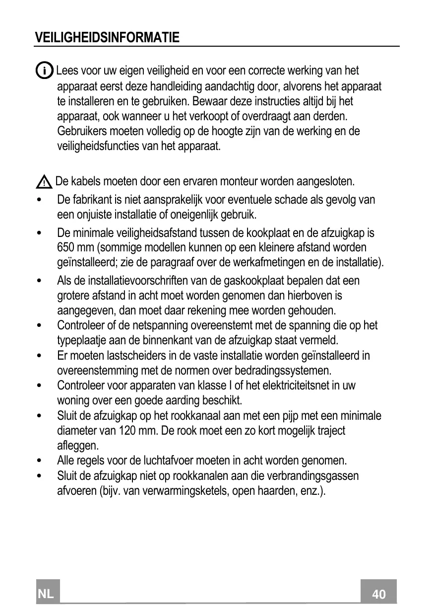 NL De kabels moeten door een ervaren monteur worden aangesloten. De fabrikant is niet aansprakelijk voor eventuele schade als gevolg van een onjuiste installatie of oneigenlijk gebruik. De minimale veiligheidsafstand tussen de kookplaat en de afzuigkap is 650 mm (sommige modellen kunnen op een kleinere afstand worden geïnstalleerd; zie de paragraaf over de werkafmetingen en de installatie). Als de installatievoorschriften van de gaskookplaat bepalen dat een grotere afstand in acht moet worden genomen dan hierboven is aangegeven, dan moet daar rekening mee worden gehouden. Controleer of de netspanning overeenstemt met de spanning die op het typeplaatje aan de binnenkant van de afzuigkap staat vermeld. Er moeten lastscheiders in de vaste installatie worden geïnstalleerd in overeenstemming met de normen over bedradingssystemen. Controleer voor apparaten van klasse I of het elektriciteitsnet in uw woning over een goede aarding beschikt. Sluit de afzuigkap op het rookkanaal aan met een pijp met een minimale diameter van 120 mm. De rook moet een zo kort mogelijk traject afleggen. Alle regels voor de luchtafvoer moeten in acht worden genomen. Sluit de afzuigkap niet op rookkanalen aan die verbrandingsgassen afvoeren (bijv. van verwarmingsketels, open haarden, enz.).