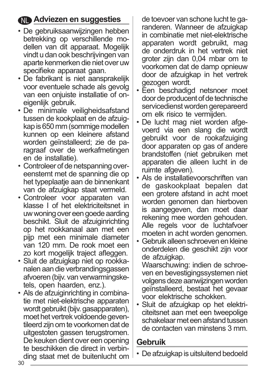 Utilisation • ATTENTION : les parties accessibles peuvent devenir très • Cette hotte aspirante a été conçue chaudes durant l’utilisation des exclusivement pour un usage doappareils de cuisson. mestique, dans le but d’éliminer les odeurs de cuisine. • Ne jamais utiliser la hotte pour Entretien des objectifs différents de ceux • Le symbole marqué sur le propour lesquels elle a été conçue. duit ou sur son emballage indique • Ne jamais laisser un feu vif allumé que ce produit ne peut pas être sous la hotte lorsque celle-ci est éliminé comme déchet ménager en fonction. normal. Lorsque ce produit doit • Régler l’intensité du feu de maêtre éliminé, veuillez le remettre à nière à l’orienter exclusivement un centre de collecte prévu pour vers le fond de la casserole, en le recyclage du matériel électrique vous assurant qu’il ne déborde et électronique. En vous assupas sur les côtés. rant que cet appareil est éliminé • Contrôler constamment les fricorrectement, vous participez teuses durant leur utilisation : à prévenir des conséquences l’huile surchauffée risque de potentiellement négatives pour s’incendier. l’environnement et pour la santé, • Ne pas flamber des mets sous la qui risqueraient de se présenter hotte : sous risque de provoquer en cas d’élimination inappropriée. un incendie. Pour toute information supplémen• Cet appareil n’est pas destiné à taire sur le recyclage de ce produit, être utilisé par des enfants d’un contactez votre municipalité, votre âge inférieur à 8 ans, ni par des déchetterie locale ou le magasin personnes dont les capacités phyoù vous avez acheté ce produit. siques, sensorielles ou mentales • Avant d’effectuer toute opérasont diminuées ou qui ont une tion de nettoyage et d’entretien, expérience et des connaissances éteindre ou débrancher l’appareil insuffisantes, à moins que ces du secteur. enfants ou ces personnes ne • Nettoyer et/ou remplacer les filtres soient attentivement surveillés et après le délai indiqué (danger instruits sur la manière d’utiliser d’incendie). cet appareil en sécurité et sur • Effectuer le nettoyage selon les les dangers que cela comporte. instructions, sous risque d’incenAssurez-vous que les enfants ne die. jouent pas avec cet appareil. Le -- Le filtre à charbon actif ne peut 10