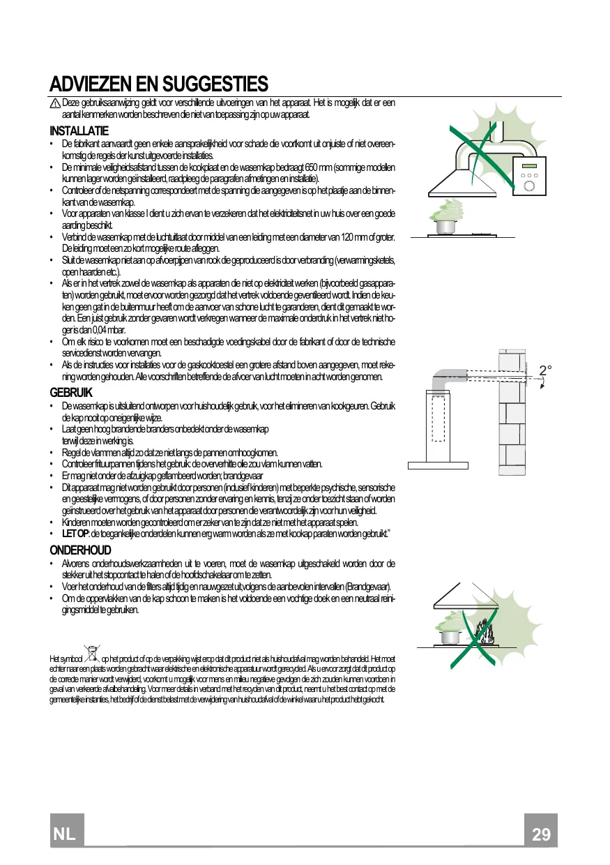 • De wasemkap is uitsluitend ontworpen voor huishoudelijk gebruik, voor het elimineren van kookgeuren. Gebruik de kap nooit op oneigenlijke wijze. • Laat geen hoog brandende branders onbedekt onder de wasemkap terwijl deze in werking is. • Regel de vlammen altijd zo dat ze niet langs de pannen omhoogkomen. • Controleer frituurpannen tijdens het gebruik: de oververhitte olie zou vlam kunnen vatten. • Er mag niet onder de afzuigkap geflambeerd worden; brandgevaar • Dit apparaat mag niet worden gebruikt door personen (inclusief kinderen) met beperkte psychische, sensorische en geestelijke vermogens, of door personen zonder ervaring en kennis, tenzij ze onder toezicht staan of worden geïnstrueerd over het gebruik van het apparaat door personen die verantwoordelijk zijn voor hun veiligheid. • Kinderen moeten worden gecontroleerd om er zeker van te zijn dat ze niet met het apparaat spelen. • LET OP: de toegankelijke onderdelen kunnen erg warm worden als ze met kookap paraten worden gebruikt.”