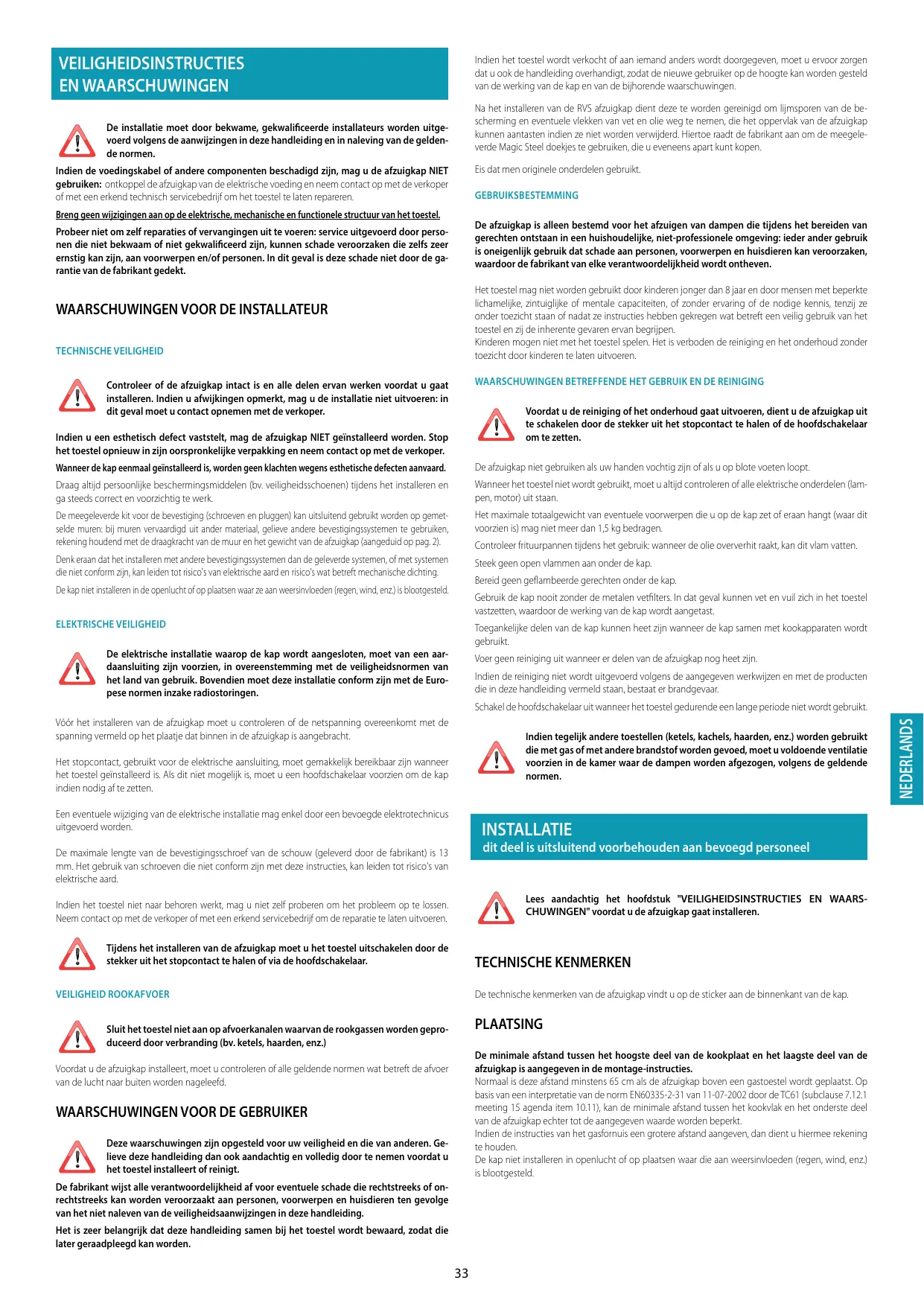 VEILIGHEIDSINSTRUCTIES EN WAARSCHUWINGEN De installatie moet door bekwame, gekwalificeerde installateurs worden uitge- voerd volgens de aanwijzingen in deze handieiding en in naleving van de gelden- de normen. Indien de voedingskabel of andere componenten beschadigd zijn, mag u de afzuigkap NIET gebruiken: ontkappel de afzuigkap van de elekrische voeding en neem contact op met de verkoper af met een erkend technisch servicebedrif om het toestel te laten repareren. Bren n aan op de elektrische, mechanische en functionele structuur van het toestel Probeer niet om zelfreparaties of vervangingen uit te voeren: service uitgevoerd door perso- nen die niet bekwaam of niet gekwalificeerd zijn, kunnen schade veroorzaken die zelfs zeer ig kan zijn, aan voorwerpen en/of personen. In dit geval is deze schade niet door de ga- rantie van de fabrikant gedekt.