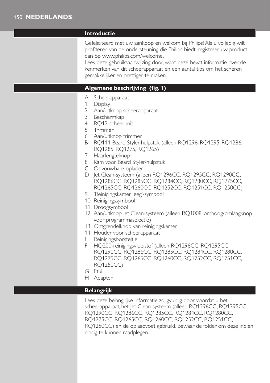 Scheerapparaat Display Aan/uitknop scheerapparaat Beschermkap RQ12-scheerunit Trimmer Aan/uitknop trimmer RQ111 Beard Styler-hulpstuk (alleen RQ1296, RQ1295, RQ1286, RQ1285, RQ1275, RQ1265) Haarlengteknop Kam voor Beard Styler-hulpstuk Opvouwbare oplader Jet Clean-systeem (alleen RQ1296CC, RQ1295CC, RQ1290CC, RQ1286CC, RQ1285CC, RQ1284CC, RQ1280CC, RQ1275CC, RQ1265CC, RQ1260CC, RQ1252CC, RQ1251CC, RQ1250CC) ’Reinigingskamer leeg’-symbool Reinigingssymbool Droogsymbool Aan/uitknop Jet Clean-systeem (alleen RQ1008: omhoog/omlaagknop voor programmaselectie) Ontgrendelknop van reinigingskamer Houder voor scheerapparaat Reinigingsborsteltje HQ200-reinigingsvloeistof (alleen RQ1296CC, RQ1295CC, RQ1290CC, RQ1286CC, RQ1285CC, RQ1284CC, RQ1280CC, RQ1275CC, RQ1265CC, RQ1260CC, RQ1252CC, RQ1251CC, RQ1250CC) Etui Adapter Belangrijk Lees deze belangrijke informatie zorgvuldig door voordat u het scheerapparaat, het Jet Clean-systeem (alleen RQ1296CC, RQ1295CC, RQ1290CC, RQ1286CC, RQ1285CC, RQ1284CC, RQ1280CC, RQ1275CC, RQ1265CC, RQ1260CC, RQ1252CC, RQ1251CC, RQ1250CC) en de oplaadvoet gebruikt. Bewaar de folder om deze indien nodig te kunnen raadplegen. NEDERLANDS 151 Gevaar -- Houd de adapter droog. Waarschuwing -- De adapter bevat een transformator. Knip de adapter niet af om deze te vervangen door een andere stekker, aangezien dit een gevaarlijke situatie oplevert. -- Het scheerapparaat, het Jet Clean-systeem en de oplaadvoet zijn niet bedoeld voor gebruik door personen (waaronder kinderen) met verminderde lichamelijke, zintuiglijke of geestelijke vermogens, of die gebrek aan ervaring of kennis hebben, tenzij iemand die verantwoordelijk is voor hun veiligheid toezicht op hen houdt of hen heeft uitgelegd hoe de apparaten dienen te worden gebruikt. -- Houd toezicht op kinderen om te voorkomen dat ze met het scheerapparaat, het Jet Clean-systeem en de oplaadvoet gaan spelen. -- Haal altijd de powerplug uit het stopcontact en trek het apparaatstekkertje uit het scheerapparaat voordat u het scheerapparaat onder de kraan schoonspoelt. Let op -- Dompel het Jet Clean-systeem en de oplaadvoet nooit in water en spoel ze ook niet af onder de kraan. -- Gebruik nooit water met een temperatuur hoger dan 80°C om het scheerapparaat schoon te spoelen. -- Gebruik het scheerapparaat, het Jet Clean-systeem, de adapter, de oplaadvoet of een ander onderdeel niet als het beschadigd is, omdat dit tot verwondingen kan leiden. Vervang een beschadigd(e) adapter, oplaadvoet of onderdeel altijd door een adapter, oplader of onderdeel van het oorspronkelijke type. -- Gebruik alleen de originele HQ200-reinigingsvloeistof voor het Jet Clean-systeem. -- Plaats het Jet Clean-systeem altijd op een stabiel, vlak en horizontaal oppervlak om lekken te voorkomen. -- Verplaats het Jet Clean-systeem niet wanneer het systeem klaar is voor gebruik, om lekken van reinigingsvloeistof te voorkomen. -- Het Jet Clean-systeem maakt grondig schoon, maar desinfecteert uw scheerapparaat niet. Daarom moet u uw scheerapparaat niet door anderen laten gebruiken. -- Gebruik nooit perslucht, schuursponzen, schurende schoonmaakmiddelen of agressieve vloeistoffen zoals benzine of aceton om het apparaat schoon te maken. -- Wanneer u het scheerapparaat schoonspoelt, kan er water lekken uit het aansluitpunt aan de onderzijde. Dit is normaal en ongevaarlijk omdat alle elektronica zich in een waterdichte voedingsunit binnen in het scheerapparaat bevindt. NEDERLANDS Naleving van richtlijnen -- Dit scheerapparaat is waterdicht en voldoet aan de internationaal erkende veiligheidsvoorschriften. Het is geschikt voor gebruik in bad of onder de douche en kan worden gereinigd onder stromend water. Om veiligheidsredenen kan het alleen snoerloos worden gebruikt. -- Het scheerapparaat en het Jet Clean-systeem voldoen aan alle toepasselijke richtlijnen en voorschriften met betrekking tot blootstelling aan elektromagnetische velden. Algemeen -- De adapter is voorzien van een automatische voltagekeuzeschakelaar en is geschikt voor een netspanning tussen 100 en 240 volt. -- De adapter zet 100-240 volt om in een veilige laagspanning van minder dan 24 volt. -- Maximaal geluidsniveau: Lc = 69 dB(A) Het display MINUTES LEFT