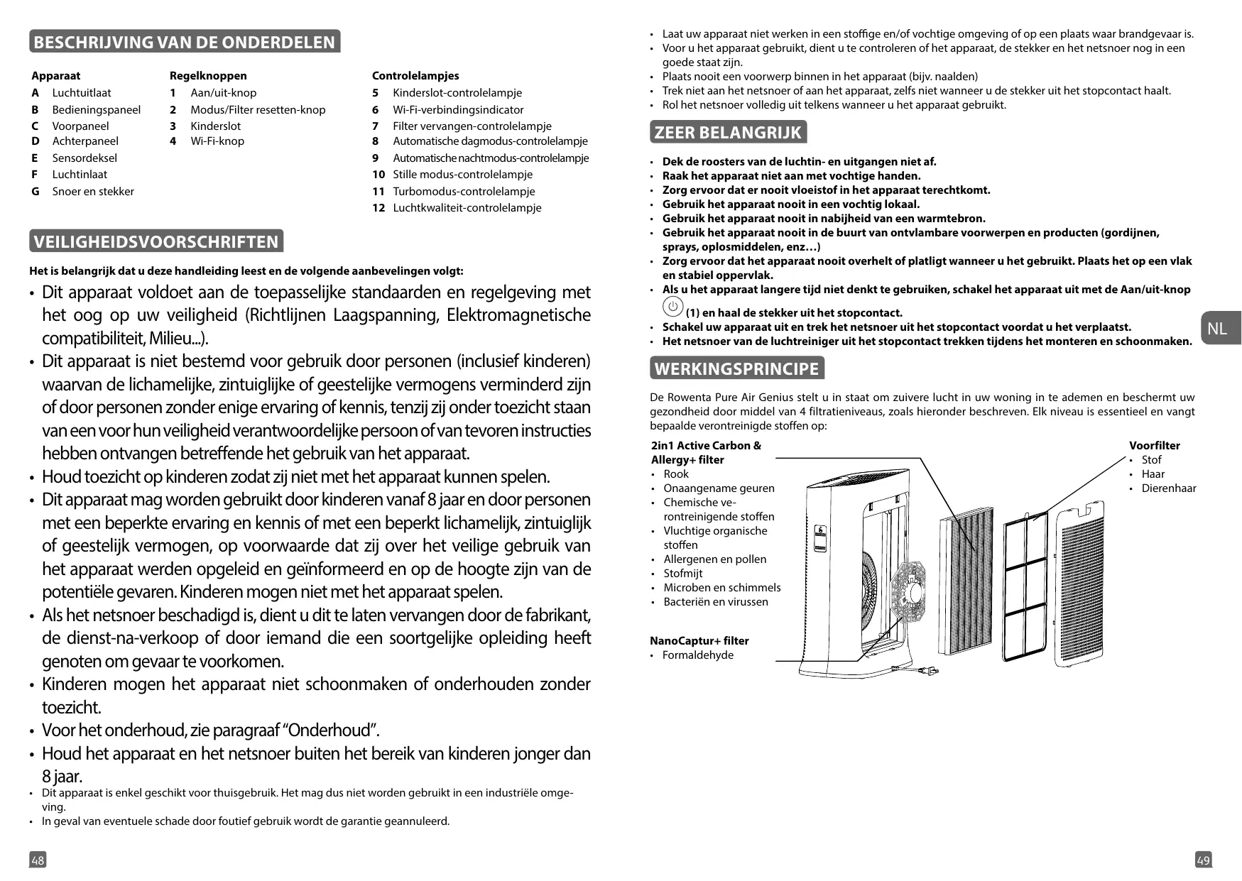 PRINCIPE DE FONCTIONNEMENT Rowenta Pure Air Genius vous permet de respirer un air pur chez vous et protège votre santé en utilisant jusqu’à 4 niveaux de filtration tel que décrit ci-après. Chaque niveau est essentiel et piège des polluants spécifiques :
