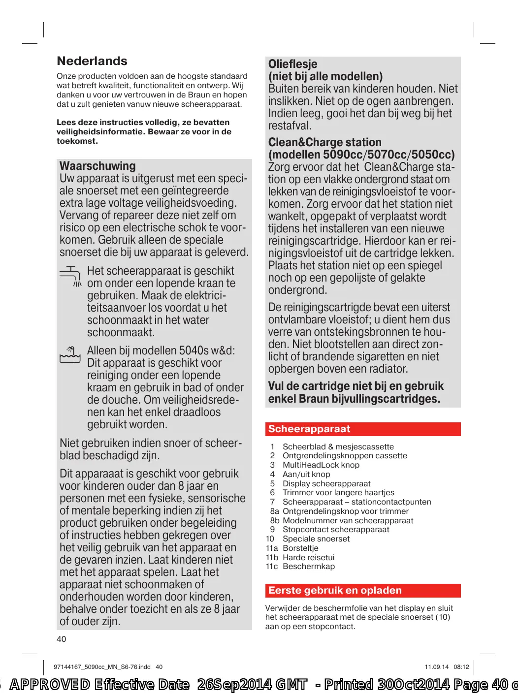 Olieflesje (niet bij alle modellen) Buiten bereik van kinderen houden. Niet inslikken. Niet op de ogen aanbrengen. Indien leeg, gooi het dan bij weg bij het restafval. Clean&Charge station (modellen 5090cc/5070cc/5050cc) Zorg ervoor dat het Clean&Charge station op een vlakke ondergrond staat om lekken van de reinigingsvloeistof te voorkomen. Zorg ervoor dat het station niet wankelt, opgepakt of verplaatst wordt tijdens het installeren van een nieuwe reinigingscartridge. Hierdoor kan er reinigingsvloeistof uit de cartridge lekken. Plaats het station niet op een spiegel noch op een gepolijste of gelakte ondergrond. De reinigingscartrigde bevat een uiterst ontvlambare vloeistof; u dient hem dus verre van ontstekingsbronnen te houden. Niet blootstellen aan direct zonlicht of brandende sigaretten en niet opbergen boven een radiator. Vul de cartridge niet bij en gebruik enkel Braun bijvullingscartridges. Scheerapparaat 1 2 3 4 5 6 7 8a 8b 9 10 11a 11b 11c
