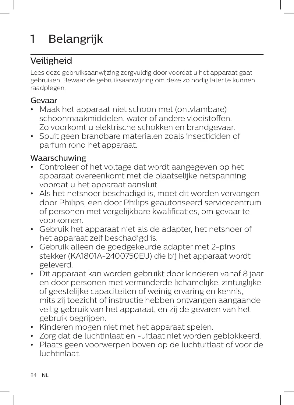 Avertissement • Avant de le brancher, vérifiez si la tension indiquée sur l'appareil correspond à la tension secteur locale. • Si le cordon d'alimentation est endommagé, il doit être remplacé par Philips, par un Centre Service Agréé Philips ou par un technicien qualifié afin d'éviter tout accident. • N'utilisez jamais l'appareil si l'adaptateur, le cordon d'alimentation ou l'appareil lui-même est endommagé. • Utilisez uniquement l'adaptateur secteur à 2 broches approuvé (KA1801A-2400750EU) fourni avec l'appareil. • Cet appareil peut être utilisé par des enfants âgés de 8 ans ou plus, des personnes dont les capacités physiques, sensorielles ou intellectuelles sont réduites ou des personnes manquant d'expérience et de connaissances, à condition que ces enfants ou personnes soient sous surveillance ou qu'ils aient reçu des instructions quant à l'utilisation sécurisée de l'appareil et qu'ils aient pris connaissance des dangers encourus. • Les enfants ne doivent pas jouer avec l'appareil. • Ne bloquez pas la circulation de l'air. • Ne placez aucun objet sur la sortie d'air ou devant l'entrée d'air. • Assurez-vous qu'aucun objet ne tombe dans l'appareil par la sortie d'air.