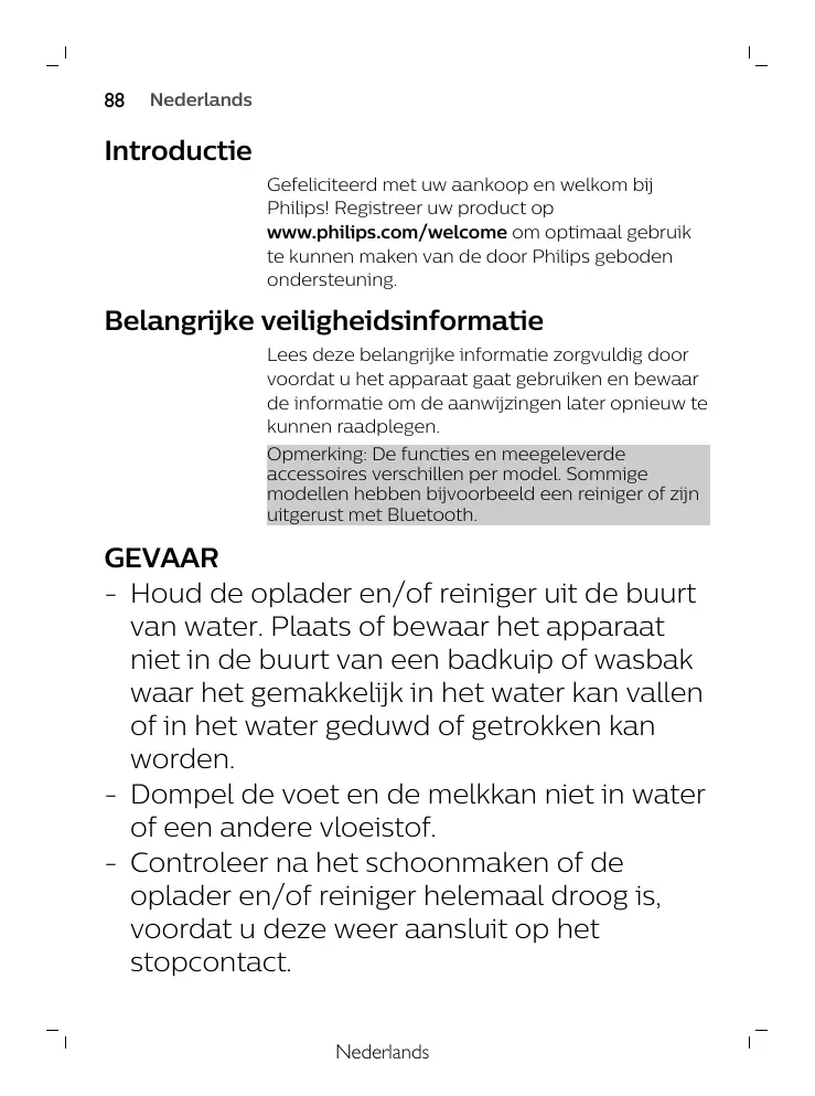 - Cet appareil ne contient aucune pièce réparable par l’utilisateur. Si l’appareil est endommagé, contactez le Service Consommateurs de votre pays (voir 'Garantie et assistance'). - Tenez le cordon d'alimentation à l'écart des surfaces chauffantes. - N’utilisez pas le chargeur et/ou l’assainisseur à l’extérieur ou près de surfaces chauffantes. ATTENTION - Ne lavez jamais la tête de brosse, le manche, le chargeur, le couvercle du chargeur ou l’assainisseur au lave-vaisselle.